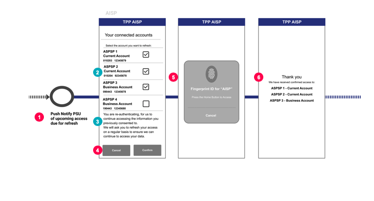 This content is best viewed on a desktop browser. 1 CEG Checklist 1AISPs should alert the PSU when authentication needs to be performed to refresh AISP access. Note: AISP may notify the PSU (in session or outside e.g via SMS or push notification) in advance and the advance period can be left in the AISPs competitive space. 2 CX Considerations 2AISPs must allow the PSU to select all the payment accounts across ASPSPs that may or may not be due for access refresh. 3 CX Considerations 3AISPs should make it clear that the PSU is being asked to authenticate to extend the AISP access to their account data and that no other element of the consent (e.g. the data permissions required, the purpose for which it will be used etc.) will change. If the customer-facing entity is acting on behalf of an AISP as its agent, the PSU must be made aware that the agent is acting on behalf of the AISP. 4 CEG Checklist 4AISPs must also allow the PSU to confirm their request after selecting the accounts. 5 CEG Checklist 5AISPs must ask the PSU to undergo SCA with the AISP provided credentials as agreed with the ASPSPs. 6 CEG Checklist 6AISPs should provide confirmation to the PSU that authentication has been successfully completed and access has been refreshed. Note: AISP may do an a-synchronised call to each ASPSP after the PSU has confirmed their request and successfully authenticated to continue access. The AISP should notify the PSU with an appropriate message that access to the respective account(s) will be refreshed with their ASPSP(s). Select to scroll left Select to scroll right