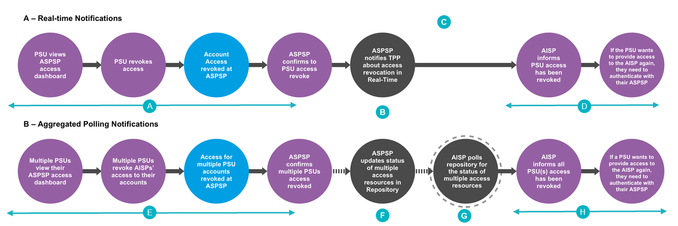CX and other processing requirements Real-time / Push Notifications A PSU revokes access from the ASPSP Access Dashboard The PSU follows the journey shown in section AIS Access Dashboard & Revocation to revoke access to their account for a specific AISP. ASPSP should confirm to the PSU that access to the account(s) has been revoked. B Real Time Push Notification from ASPSP to AISP The ASPSP should notify the AISP in real time (i.e. immediately) after the PSU revokes their access at their ASPSP Access dashboard. The implementation of the real-time mechanism is defined in the OBIE technical specifications. C Push Notification for Offline AISPs (ASPSP to AISP) ASPSPs should also be able to use push notification mechanisms to notify AISPs whose systems are offline that PSUs revoked their access using the ASPSPs’ access dashboards. This removes the requirement for AISPs to have systems up and running 24×7 in order to receive real-time push notifications from ASPSPs. Once the AISPs’ systems are available again, ASPSPs should push again any notifications required to the AISPs, so that AISPs can update their systems. In addition to PSU revocation of access, ASPSPs should be able to notify the AISPs when access to account(s): has been suspended by ASPSP due to changes in the account access resource for any valid reason (e.g. CASS by PSU, joint holder revoking access, account closed, etc.) and could provide the reason code, if appropriate. is no longer available due to changes in the state of the access token for any valid reason (e.g. token has expired, token has been suspended by the ASPSP due to fraud etc.) and could provide the reason code, if appropriate. D Notification to PSU by AISP Upon receipt of the notification by the ASPSP, the AISP should notify the PSU, if required, that the access to their ASPSP account(s) is no longer possible. AISPs should present the PSU with the implications of the access revocation in case there are ‘unintended’ consequences’. However, unintended consequences may not be applicable in many cases. PSUs could then take their preferred actions such as continuing to use the service or stop. If the former, they will be required to authenticate again with their ASPSPS in order to provide access to the AISPs. If the latter, PSUs may also want to remove their consent with the AISPs. Aggregated Polling / Pull Notifications E Multiple PSUs revoke access from the ASPSP Access Dashboard Multiple PSUs, during a period of time, follow the journey shown in section AIS Access Dashboard & Revocation to revoke access to their account for a specific AISP. For each PSU access, revocation, the ASPSP should confirm to the PSU that access to the account(s) has been revoked. F ASPSP updates the access status on events Repository For all PSUs access revocations, the ASPSP should update the status of the access resources in an events Repository organised per each AISP. G Aggregated ‘Polling’ / Pull Notification of ASPSP by AISP Similar to basic polling, aggregated Polling is about the provision of notification of revocations from ASPSPs to AISPs, upon AISP request, enabling AISPs to update their records and contact the PSUs, if required, at the point in time of the request. However, the key difference is that rather than focusing on a specific access resource’s status (via a GET request on that specific resource), aggregated polling allows an AISP to request an aggregated set of access revocations and other account access events related to multiple access consents from multiple PSUs during a specific period. ASPSPs should provide to the polling AISP all the access resource status and other information stored in the repository for that specific AISP, upon AISP request. In addition to PSU revocation of access, ASPSPs should be able to notify the AISPs when access to account(s): has been suspended by ASPSP due to changes in the account access resource for any valid reason (e.g. CASS by PSU, joint holder revoking access, account closed, etc.) and could provide the reason code, if appropriate. is no longer available due to changes in the state of the access token for any valid reason (e.g. token has expired, token has been suspended by the ASPSP due to fraud etc.) and could provide the reason code, if appropriate. Note: This functionality makes much more efficient usage of the ASPSPs and AISPs network bandwidth as multiple single polls, especially with no change of access status, are avoided. Moreover, it allows AISPs to receive all the required notifications without the need to implement systems with high availability (e.g. systems running 24×7) or systems based on real-time push notifications, providing full flexibility to AISPs about the timing they want to receive the notifications based on their business models. H Notification to multiple PSUs by AISP Upon receipt of the aggregated polling information by the ASPSP, the AISP should notify all the PSUs, when required, that their access to their ASPSP account(s) is no longer possible. AISPs should present to all PSUs the implications of the access revocation in case there are ‘unintended’ consequences’. However, unintended consequences may not be applicable in many cases. PSUs could then take their preferred actions such as continuing to use the service or stop. If the former, they will be required to authenticate again with their ASPSPS in order to provide access to the AISPs. If the latter, PSUs may also want to remove their consent with the AISPs.