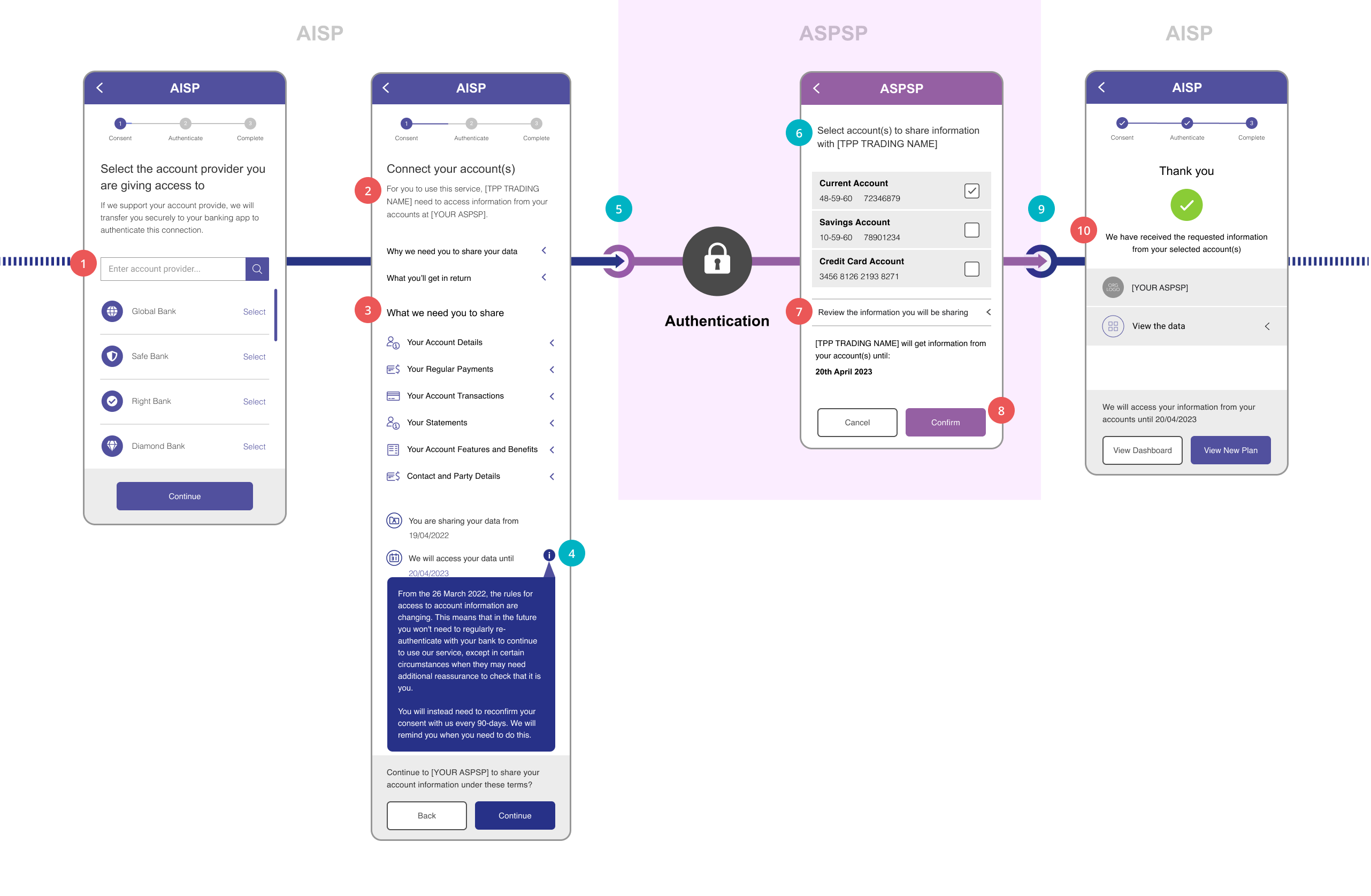PSU selects the ASPSP(s) where their payment account(s) is held. The PSU is then directed to the domain of its ASPSP for authentication and to select the account(s) they want to give access to. Once the PSU has been authenticated, their ASPSP will be able to respond to the AISP’s request by providing the account information that has been requested.