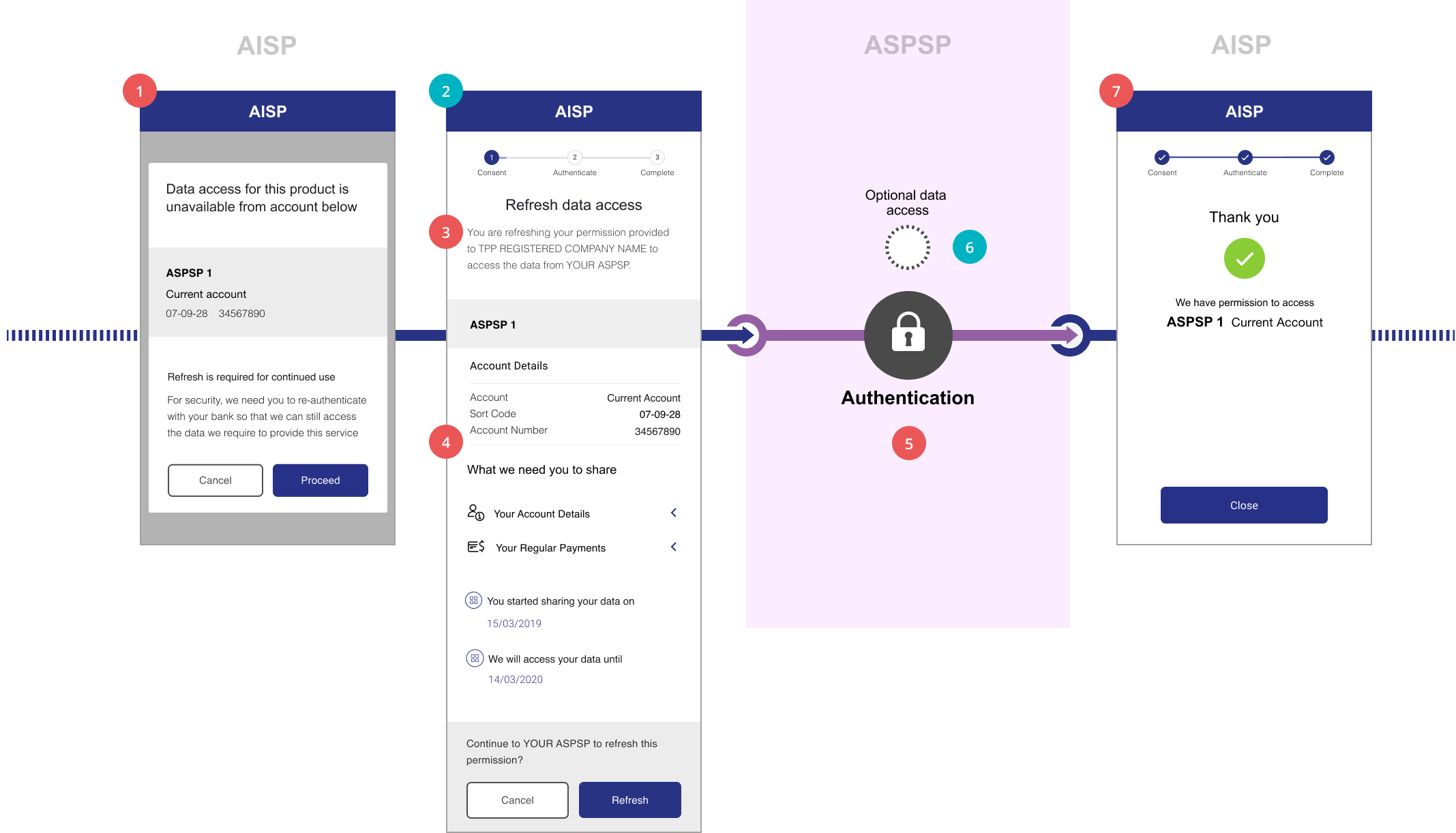 The PSRs require strong customer authentication to be performed each time the PSU accesses its online payment account, either directly or using the services of an AISP. The frequency of authentication can be reduced if an ASPSP applies the exemption relevant to account information access (RTS, Article 10).  However, this will still require the PSU to be authenticated at least every 90 days. This section describes the customer journey when a PSU needs to refresh AISP access, so the AISP can continue to provide the service previously consented to by authenticating again at their ASPSP. All other elements of the consent (data permissions required, purpose for which the data will be used, transaction history period and consent expiration date) remain unchanged.