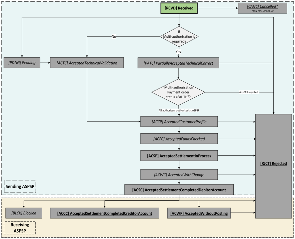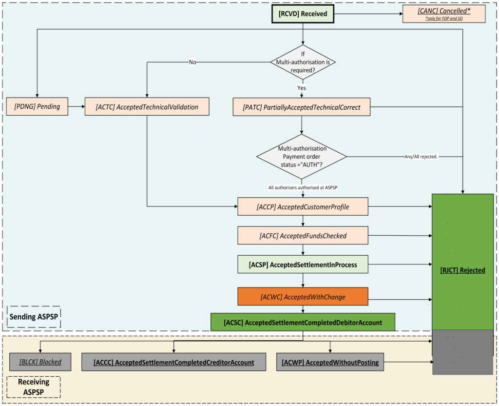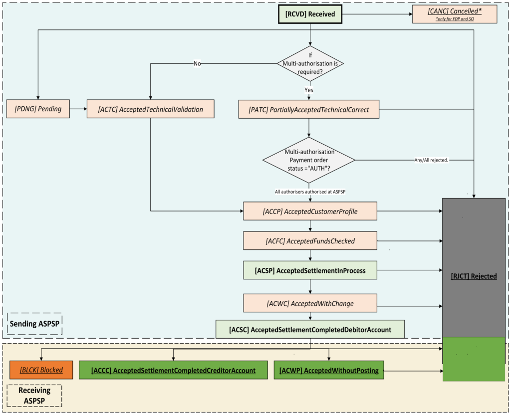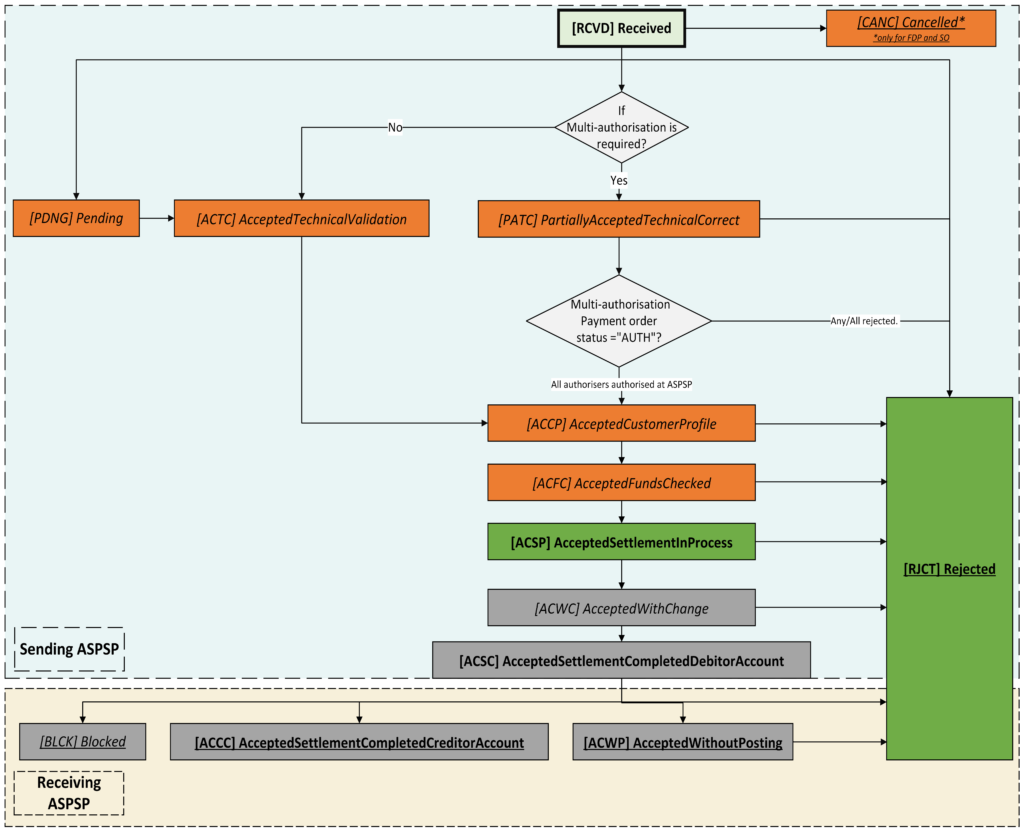 • If the receiving ASPSP confirms that they have received the payment but have not credited the beneficiary account yet, then the payment order resource status must become ‘ACWP’ which means ‘Accepted Without Posting’. The receiving ASPSP will provide a specific reason code in such instances to the sending ASPSP. The sending ASPSP must provide this alongside the payment order resource status under the status reason code.