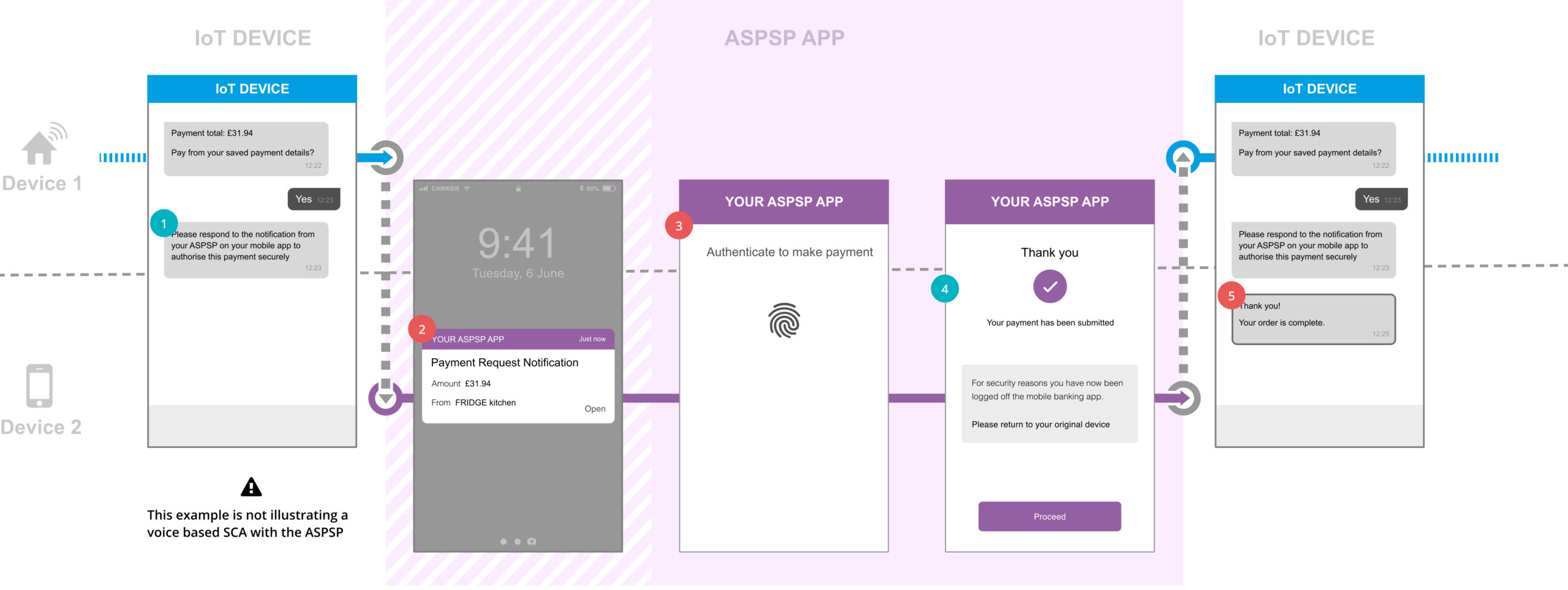 PISP IoT device through voice enabled commands asks if they would like to checkout for the requested payment using their stored ASPSP account. After the PSU confirms, the PISP uses the stored PSU identity with the ASPSP to request for payment.