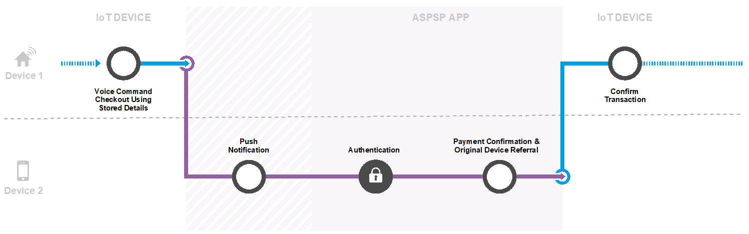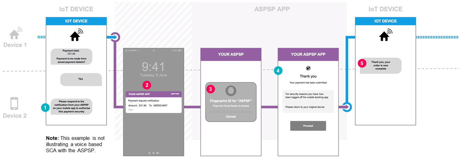 This content is best viewed on a desktop browser. 1 CX Considerations 1PISP IoT device through voice enabled commands asks if they would like to checkout for the requested payment using their stored ASPSP account. After the PSU confirms, the PISP uses the stored PSU identity with the ASPSP to request for payment. 2 CEG Checklist Requirements 2The ASPSP must notify the PSU through the ASPSP app for authentication purposes only without introducing any additional screens. The notification must clearly mention the payment request with the amount and the payee. 3 CEG Checklist Requirements 3The ASPSP app based authentication must have no more than the number of steps that the PSU would experience when directly accessing the ASPSP mobile app (biometric, passcode, credentials). 4 CX Considerations 4The ASPSP must make the PSU aware that they have been logged off from the ASPSP app and notify them to check back on the originating PISP app. 5 CEG Checklist Requirements 5The PISP must confirm successful confirmation of payment initiation. Select to scroll left Select to scroll right