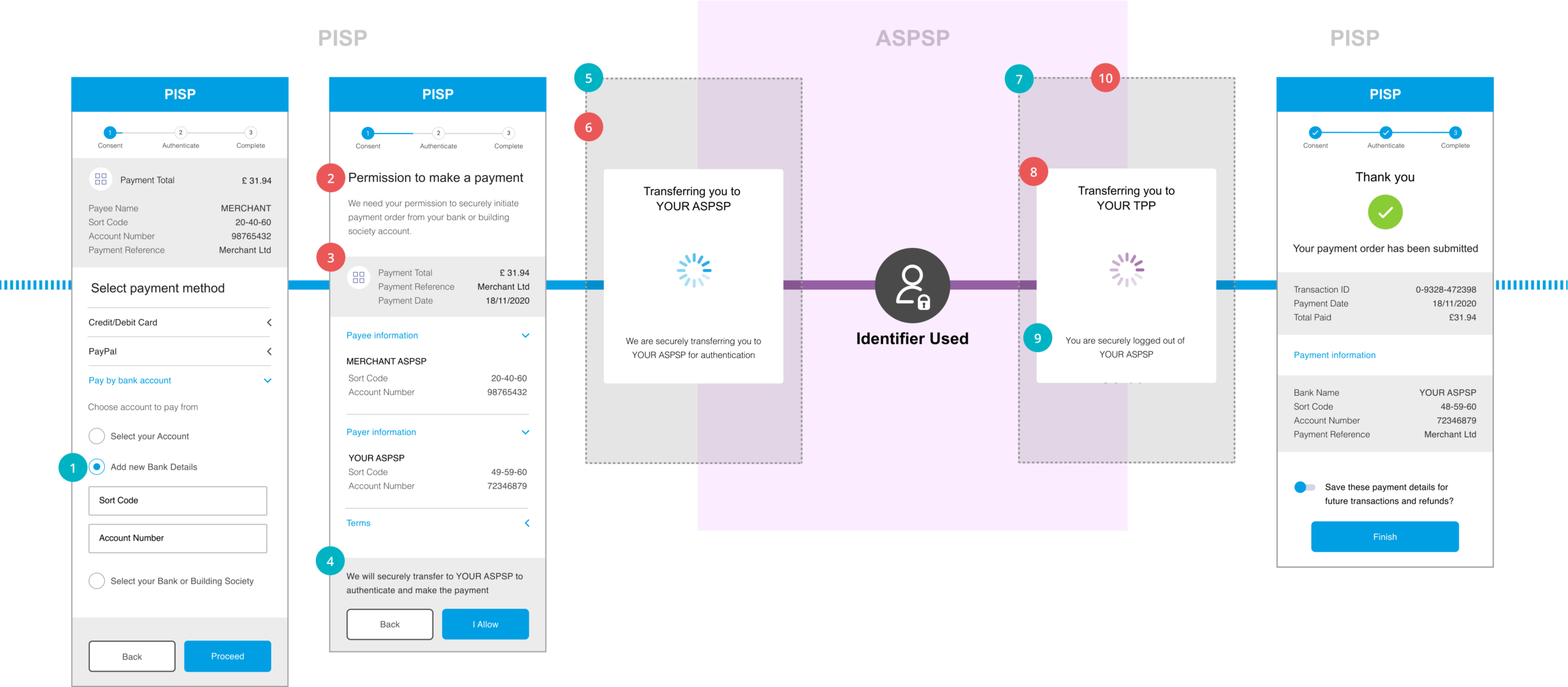 This content is best viewed on a desktop browser. 1 CX Considerations 1PISP should allow the PSU to select the payment account identification details of a particular ASPSP that have previously been used and stored. The PISP will need to provide to the ASPSP a hint of the PSU’s identity by sending the customer identifier as part of the payment request. This could then be used by the ASPSP to facilitate a journey with less friction, in instances where the ASPSP determines that SCA is not required based on an available exemption. 2 CEG Checklist Requirements 2PISPs must allow the PSU to either enter the account details or select the account with their ASPSP. 3 CEG Checklist Requirements 3PISPs must communicate information clearly to the PSU when obtaining consent in order to initiate the payment order. 4 CX Considerations 4PISPs should provide messaging to inform PSUs that they will be taken to their ASPSPs to complete the payment. Example wording: %22You will be securely transferred to YOUR ASPSP to authenticate and make the payment“. Note: In the case of a journey where the ASPSP will determine that an SCA exemption can be applied, this point would have been the PSUs’ “point of no return” for making the payment. However, as PISPs are not in position to know whether that would be the case or not, they cannot really inform the PSUs about being at the “point of no return” for making the payment. PISPs may decide to provide some additional messaging to PSUs to handle this. 5 CX Considerations 5PISPs should provide messaging on their inbound redirection screen to inform PSU that they will be taken to their ASPSP to authenticate to complete the payment. PISP should display in the Redirection screen the Payment Amount, Currency and the Payee Account Name to make the PSU aware of these details. 6 CEG Checklist Requirements 6If the PSU has an ASPSP app installed on the same device the redirection must invoke the ASPSP app for authentication purposes only without introducing any additional screens and offer the same authentication method(s) available to the PSU when authenticating in their ASPSP’s direct channels. 7 CX Considerations 7ASPSPs should have outbound redirection screen which indicates the status of the request and informs the PSU that they will be automatically taken back to the PISP. 8 CEG Checklist Requirements 8ASPSPs must display as minimum the Payment Amount, Currency and the Payee Account Name on to make the PSU aware of these details (unless an SCA exemption is being applied). These details must be displayed as part of the authentication journey on at least one of the following screens without introducing additional confirmation screens (unless supplementary information is required, refer to section Single Domestic Payments – Supplementary info): 1. Authentication screen; 2. ASPSP to PISP outbound redirection screen. 9 CX Considerations 9ASPSPs should inform the PSU on the outbound redirection screen that they are being redirected back to the PISP. Note: This would be based on customer identifier being provided by the PISP and the transaction being eligible for any available exemptions and the ASPSP applying the exemption. 10 CEG Checklist Requirements 10PSU must be redirected straight back to the PISP website/app on the same device where PISP displays confirmation of successful initiation. Select to scroll left Select to scroll right