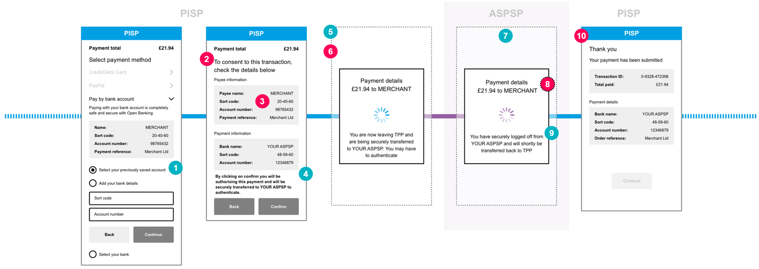 This content is best viewed on a desktop browser. 1 CX Considerations 1PISP should allow the PSU to select the payment account identification details of a particular ASPSP that have previously been used and stored. The PISP will need to provide to the ASPSP a hint of the PSU’s identity by sending the customer identifier as part of the payment request. This could then be used by the ASPSP to facilitate a journey with less friction, in instances where the ASPSP determines that SCA is not required based on an available exemption. 2 CEG Checklist Requirements 2PISPs must allow the PSU to either enter the account details or select the account with their ASPSP. 3 CEG Checklist Requirements 3PISPs must communicate information clearly to the PSU when obtaining consent in order to initiate the payment order. 4 CX Considerations 4PISPs should provide messaging to inform PSUs that they will be taken to their ASPSPs to complete the payment. Example wording: %22You will be securely transferred to YOUR ASPSP to authenticate and make the payment“. 5 CX Considerations 5PISPs should provide messaging on their inbound redirection screen to inform PSU that they will be taken to their ASPSP to authenticate to complete the payment. PISP should display in the Redirection screen the Payment Amount, Currency and the Payee Account Name to make the PSU aware of these details. 6 CEG Checklist Requirements 6If the PSU has an ASPSP app installed on the same device the redirection must invoke the ASPSP app for authentication purposes only without introducing any additional screens and offer the same authentication method(s) available to the PSU when authenticating in their ASPSP’s direct channels. 7 CX Considerations 7ASPSPs should have outbound redirection screen which indicates the status of the request and informs the PSU that they will be automatically taken back to the PISP. 8 CEG Checklist Requirements 8ASPSPs must display as minimum the Payment Amount, Currency and the Payee Account Name on to make the PSU aware of these details (unless an SCA exemption is being applied). These details must be displayed as part of the authentication journey on at least one of the following screens without introducing additional confirmation screens (unless supplementary information is required, refer to section Single Domestic Payments – Supplementary info): 1. Authentication screen; 2. ASPSP to PISP outbound redirection screen. 9 CX Considerations 9ASPSPs should inform the PSU on the outbound redirection screen that they are being redirected back to the PISP. Note: This would be based on customer identifier being provided by the PISP and the transaction being eligible for any available exemptions and the ASPSP applying the exemption. 10 CEG Checklist Requirements 10PSU must be redirected straight back to the PISP website/app on the same device where PISP displays confirmation of successful initiation. Select to scroll left Select to scroll right