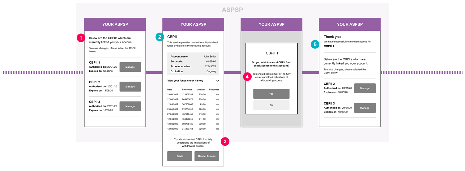 This content is best viewed on a desktop browser. 1 CEG Checklist Requirements 1Access Dashboard ASPSPs must provide PSUs with Access Dashboard. The ASPSP Access Dashboard must display all Confirmation of Funds access authorisations provided to each CBPII. Thus, for each PSU account there must be a corresponding explicit consent entry for each CBPII that has been granted CoF access to the account by the PSU. The Access Dashboard must also describe for each authorisation: The status of the authorisation e.g. Active/Inactive. The ongoing nature of the access or when the CBPII access to the account will expire. The date the CoF access was granted by the PSU. 2 CX Considerations 2CoF Access History For each CBPII having CoF access, ASPSPs should display the PSUs account details including account name, sort code, account number and expiration date and time. ASPSPs must also provide PSUs with the ability to request all the CoF access history (CoF requests and responses) under a specific CBPII. This must include the identity of the CBPII who made the request, and the response (Y/N) given. ASPSPs should provide this functionality via the Access Dashboard. Note: While OBIE recommends the use of the Access Dashboard for provision of CoF Access History to the PSU, it is in the domain of each ASPSP to consider alternative options to meet their regulatory requirements for the provision of the COF access history. The COF history could also include the following: The date the Confirmation of Funds request has been received by the ASPSP. The unique reference of the CoF request. The amount in relation on the CoF request. Please note that in case ASPSPs are unable to provide a response to a CoF request to the CBPII, a reason should be provided in the history entry for this CoF request. 3 CEG Checklist Requirements 3ASPSPS must allow PSUs to revoke the CoF access for each CBPII to a specific PSU account. ASPSPs must advise PSUs that they should contact the associated CBPII to fully understand the potential implications of doing so. 4 CEG Checklist Requirements 4Revocation Request ASPSPs must allow PSUs to confirm that they want to revoke CoF access of their account to a specific CBPII. ASPSPs should inform PSUs that once CoF access is revoked, the CBPII will no longer be able to check the availability of funds in their account. This may cause their CBPII transactions to be declined. ASPSPs must advise PSUs that they should contact the associated CBPII to inform them of the cancellation of CoF access to their account and/or fully understand the potential implications of doing so. ASPSPs must give equal prominence to the choices of continuing or cancelling the CBPII CoF access. 5 CX Considerations 5ASPSPs should confirm to PSUs that CoF access to their account has been cancelled. Select to scroll left Select to scroll right