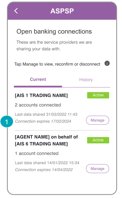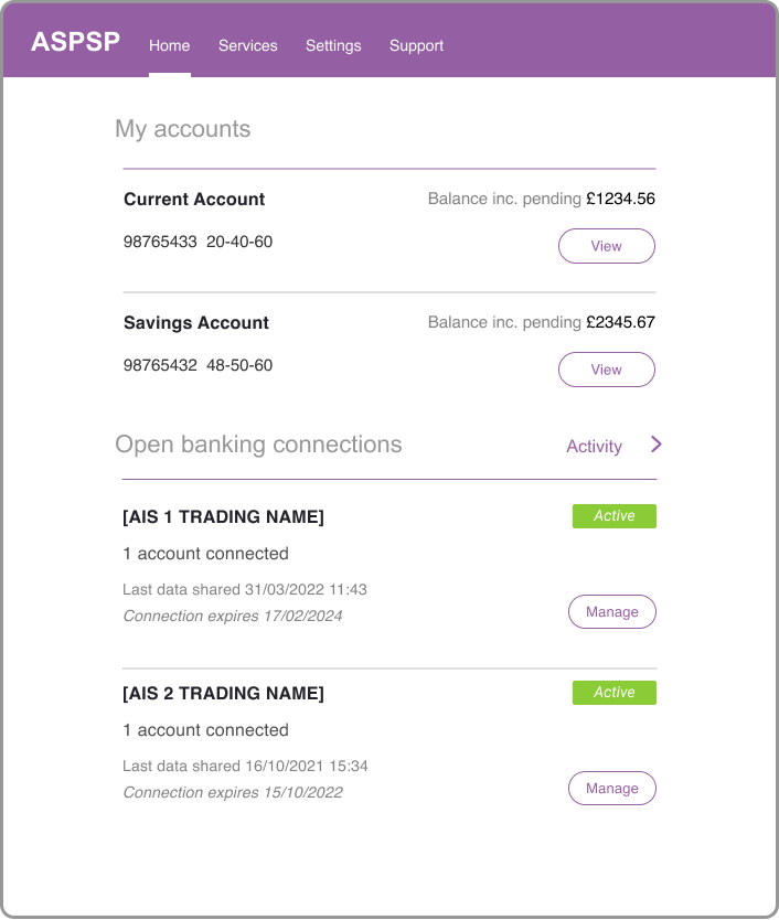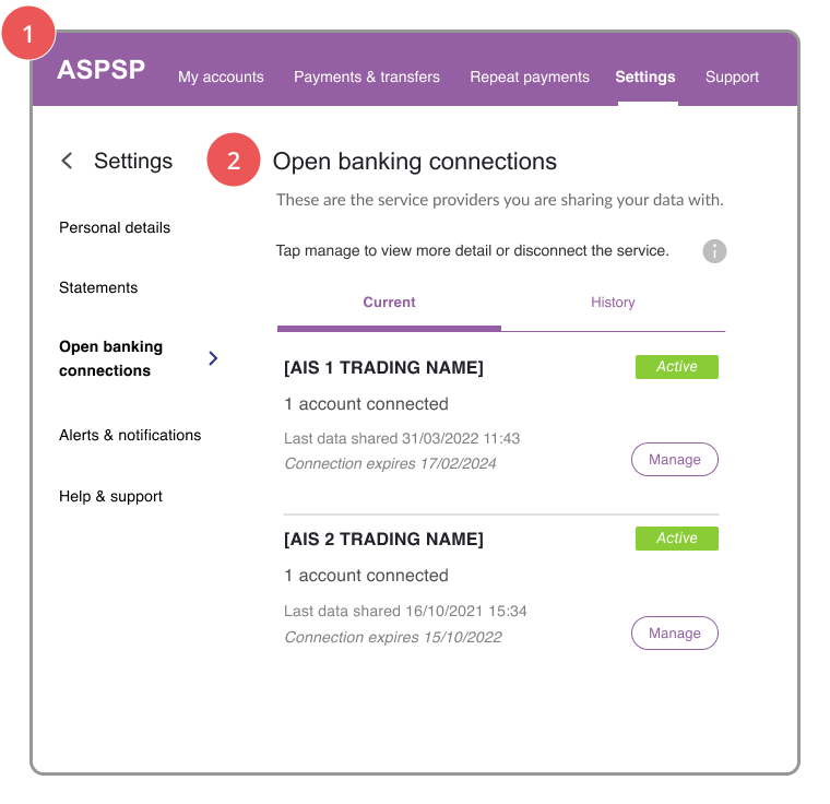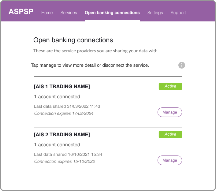 AIS Access Dashboard Examples An important aspect of ensuring that the Dashboard is easy to find and locate is the naming of the Dashboard itself within navigation menus. The name of the Dashboard should use terms familiar to PSUs and avoid technical jargon such as consent, permission and AISP. The preferred name when acting solely as an AISP is “open banking connections” and/or “open banking connected services.” If the provider is operating as both ASPSP and AISP, they should clearly distinguish the Consent Dashboard from the Access Dashboard; the former should be named “Open Banking connected accounts” and the latter should be “open banking connected services.”Finally, the placement of the Dashboard may be irrelevant if PSUs are not aware of its existence or the functionality it provides. An explanation of where and what the Dashboard is, and the role it plays, would be a useful tutorial for new customers after they have signed up. While this is left to the discretion of participants, we have provided guidelines on PSU Notifications for reference. ASPSP Access Dashboard for AIS – as home page Figure 1: ASPSP Access Dashboard for AIS – zero-clicks from home page (desktop) ASPSP Access Dashboard for AIS – one click Figure 2: ASPSP Access Dashboard for AIS – one-click from home page (desktop) ASPSP Access Dashboard for AIS – two clicks Figure 3: ASPSP Access Dashboard for AIS – two clicks from home page (desktop)