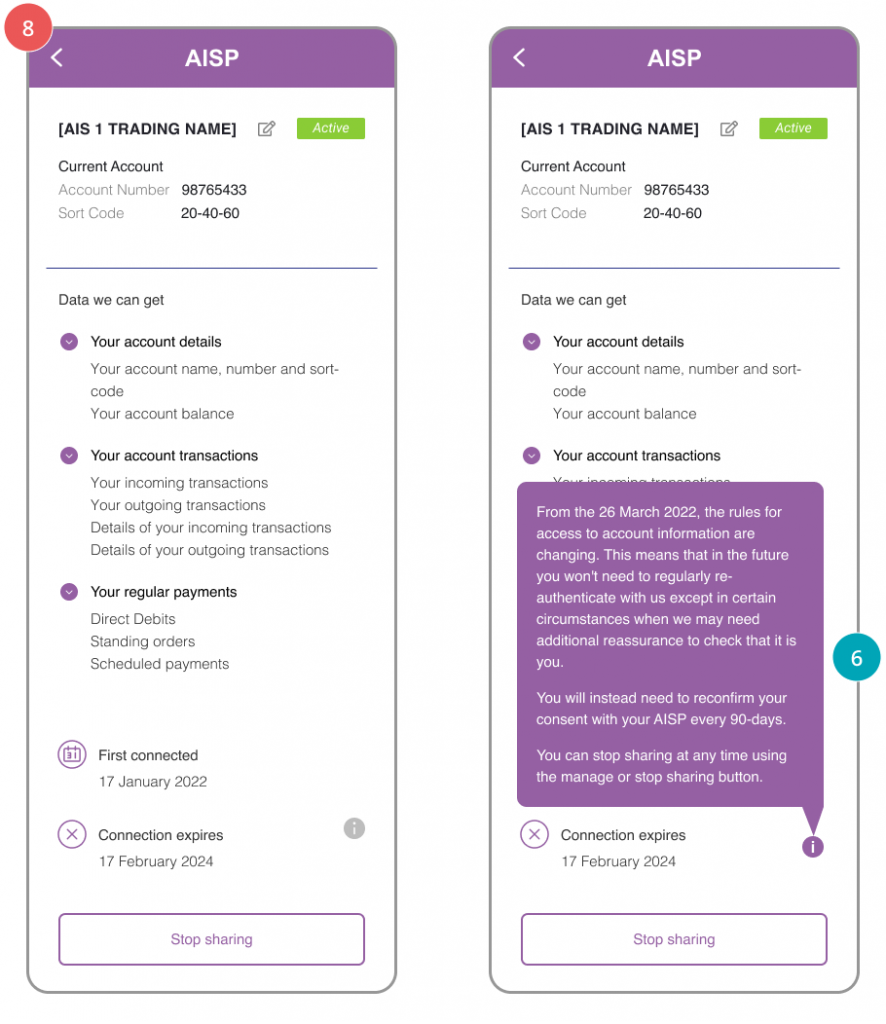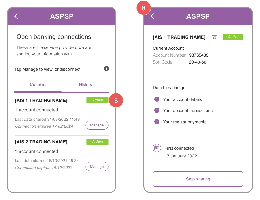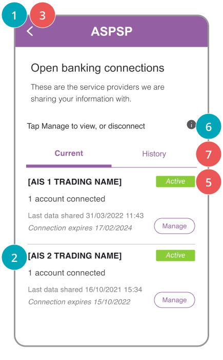 This content is best viewed on a desktop browser. 1 CEG Checklist Requirements 1The ASPSP must provide a manage button that takes the PSU to the detailed view where they are able to revoke access. 2 CEG Checklist Requirements 2ASPSPs should make the status of TPP access clear using “Active” or “Connected” and either emboldened words or other design options like colouring as shown in the wireframe.ASPSPs should show as a minimumwhen data was last shared with the TPP (this may be a specific date and time, or a range (e.g. within the last [x] days)).the expiry date of the consent.Note: Refer to Dashboards – Figure 3: Access Dashboards that handle AIS (Data), VRP (Payments) and CBPII (Funds check) on alternate ways in which ‘Last data shared’ can be shown to the PSU. 3 CEG Checklist Requirements 3The Access Dashboard must allow a PSU to revoke the access they have consented to easily and without obstruction or excessive barriers. 4 CEG Checklist Requirements 4ASPSPs must advise PSUs that they should contact the associated AISP to inform them of the cancellation of access and/or understand the consequences of revoking access. 5 CEG Checklist Requirement 5ASPSPs must update the status of the consent with appropriate reasons. ASPSP could allow the PSU to capture a reason and provide it to the PISP when queried using the relevant GET consent endpoint. Select to scroll left Select to scroll right