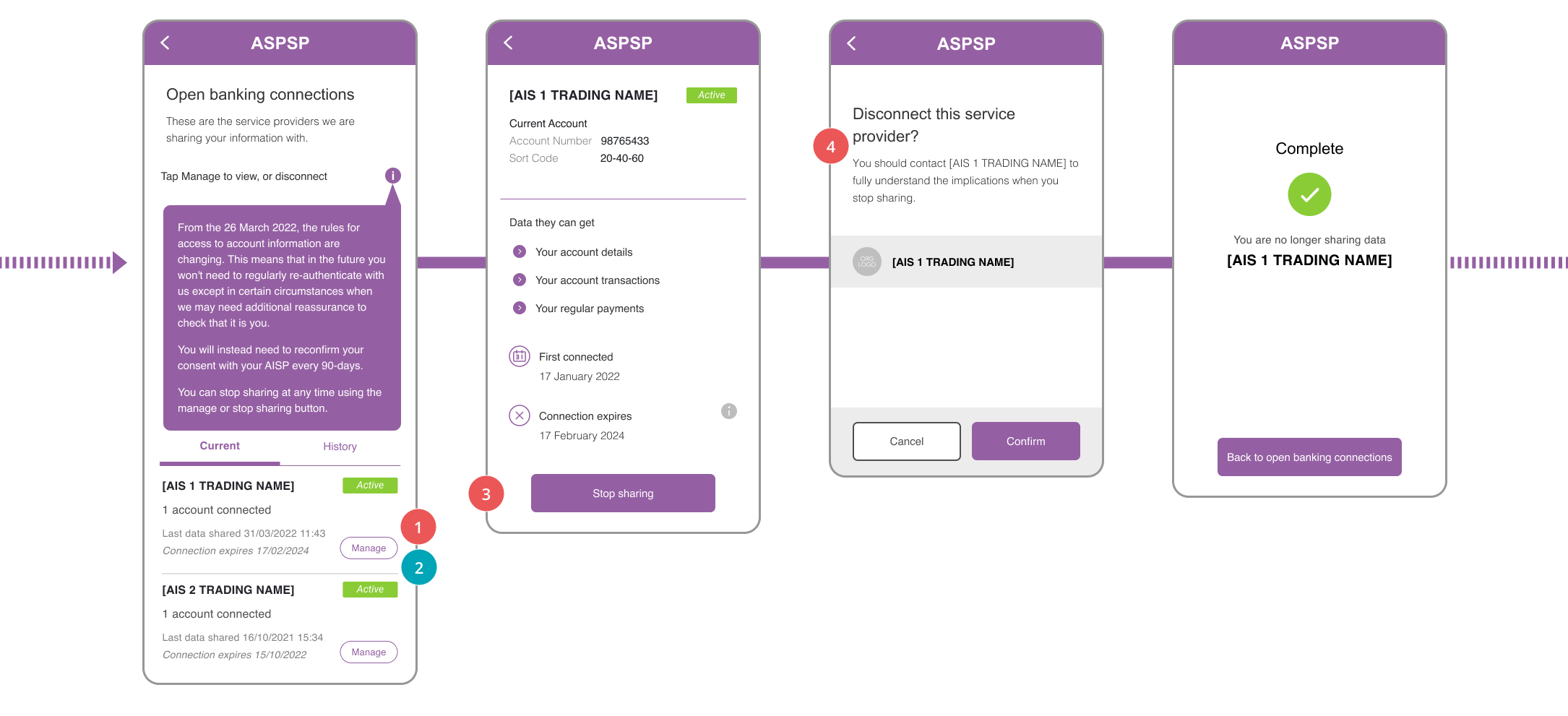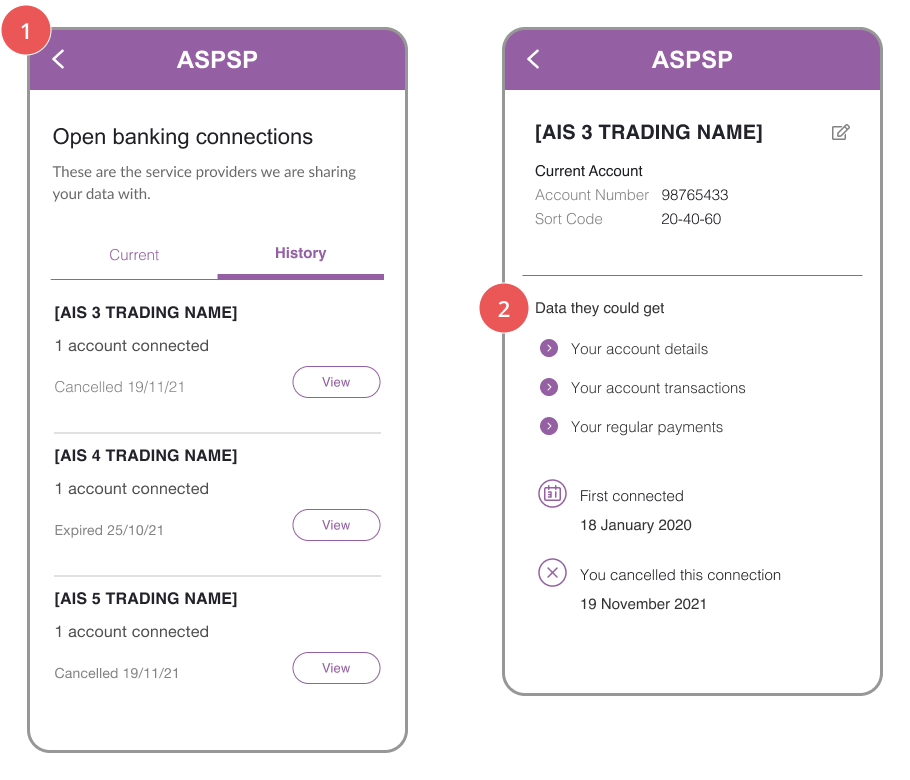 Dashboards play an important role in managing the data for which a PSU has provided access consent for an AISP to access from their ASPSP. PSUs may have consented to share data from several accounts with a single AIS. ASPSPs must provide PSUs a dashboard to view and revoke the ongoing access for each account.
