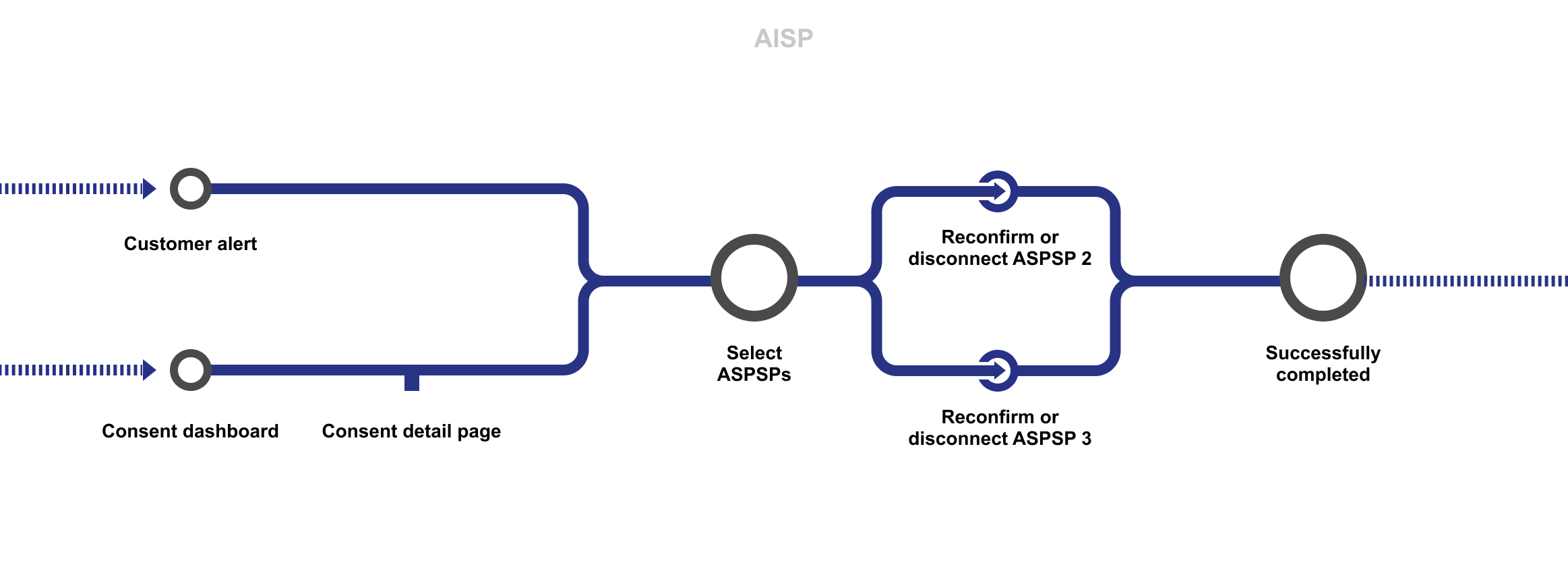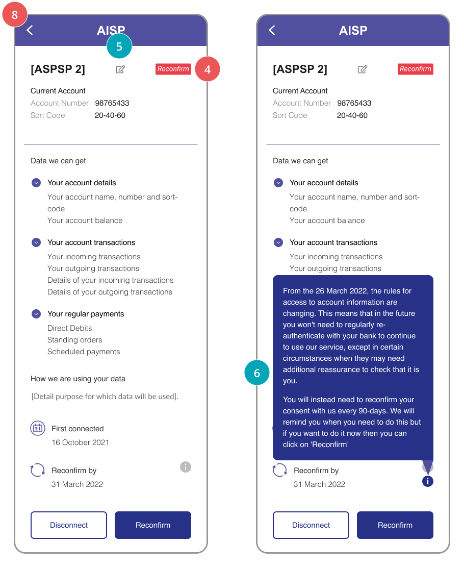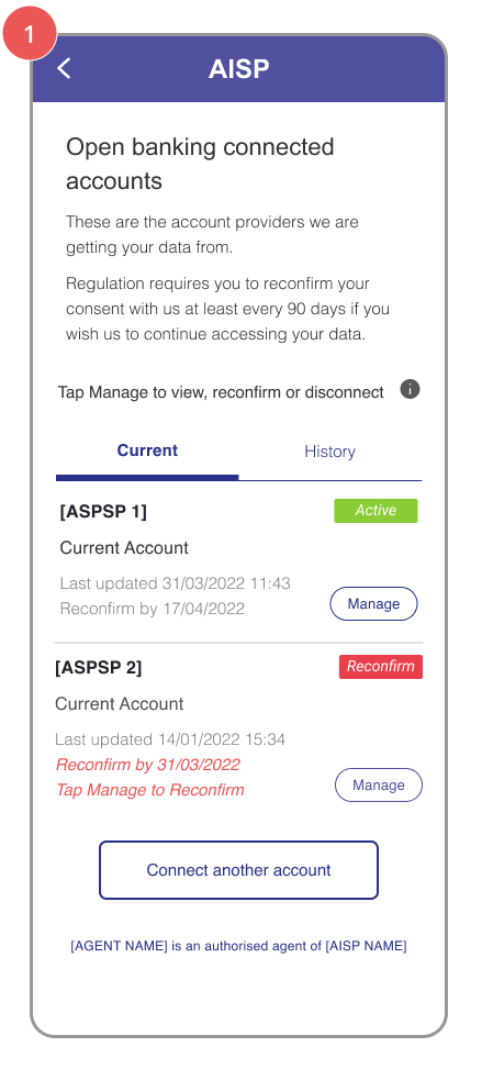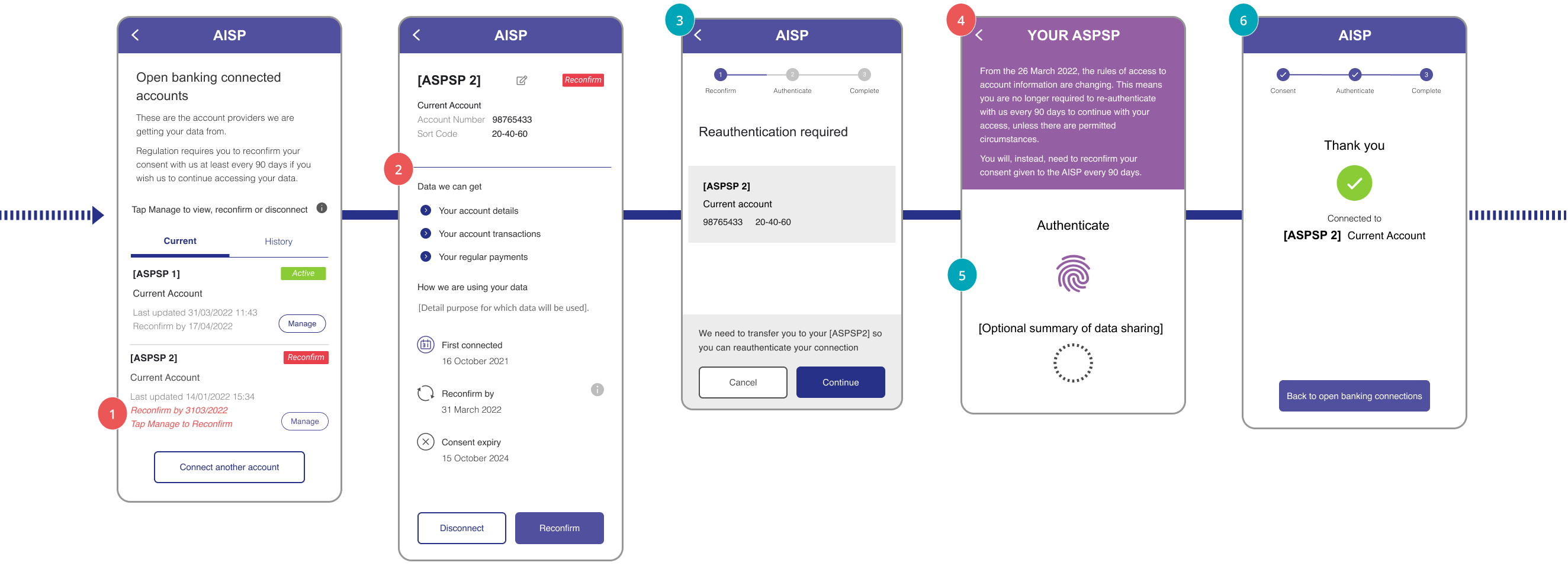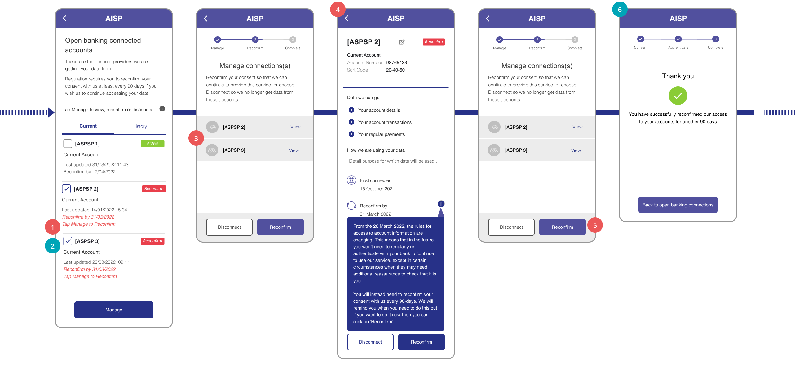 This content is best viewed on a desktop browser. 1 CEG Checklist Requirements 1AISPs must alert the PSU when reconfirmation of consent is required. There are many ways a PSU could receive this notification: as an alert, a message from the homepage or when checking their consent dashboard.If the PSU reconfirms a single consent via their consent dashboard, the customer journey would be consent dashboard homepage, detailed consent page, a summary of reconfirmation details.If the PSU is notified that they need to reconfirm consent, the AISP can take the PSU straight to the Summary of reconfirmation page.If the PSU reconfirms multiple consents via their consent dashboard, the customer journey would be as in figure 10: Consent Dashboard Homepage (select multiple consents), Summary & Confirmation completion after authentication at AISP.AISPs must not access data if the PSU has not reconfirmed consent. 2 CEG Checklist Requirements 2AISPs should allow the PSU to select all the payment accounts across ASPSPs that may or may not be due for reconfirmation.AISPs should make it clear that the PSU is being asked to authenticate to extend the AISP access to their account data and that no other element of the consent (e.g., the data permissions required, the purpose for which it will be used etc.) will change. 3 CEG Checklist Requirements 3AISPs must display the company’s trading name/brand name (i.e. the Client Name) to the PSU. If the AISP is only trading with its registered company name then it must display that name to the PSU.If the AISP is not the customer-facing entity and there is an Agent who is acting on behalf of the AISP, then the Agent must make the PSU aware that they are acting as an agent on behalf of the AISP and must also, display the AISP’s full trading name/brand name or registered company name whichever is the customer-facing brand of the AISP. AISPs must also, populate the Agent company name in the ‘On behalf of’ field of the software statement, in order to inform the ASPSP about the agency relationship and allow the ASPSP to be able to display this information to the PSU. Only in instances where there is an Agent acting on behalf of the AISP, the ‘On Behalf of’ name must be displayed to the PSU. AISPs must not populate the ‘ On behalf of’ field with the details of their TSP.The customer-facing entity must provide PSUs with sufficient information to enable them to make an informed decision. For example, detail the purpose for which the data will be used (including whether any other parties will have access to the information), the period over which it has been requested and when the consent for the account information will expire (consent could be ongoing or one-off). 4 CEG Checklist Requirements 4AISPs must also allow the PSU to select each consent and view the data permissions (clusters) that are associated with the consent without the need to change the consent. 5 CEG Checklist Requirements 5AISPs must allow the PSU to explicitly reconfirm their consent with equal prominence given to continue or discontinue the service. 6 CEG Checklist Requirements 6AISPs should provide confirmation to the PSU that reconfirmation of consent has been successfully completed. Select to scroll left Select to scroll right