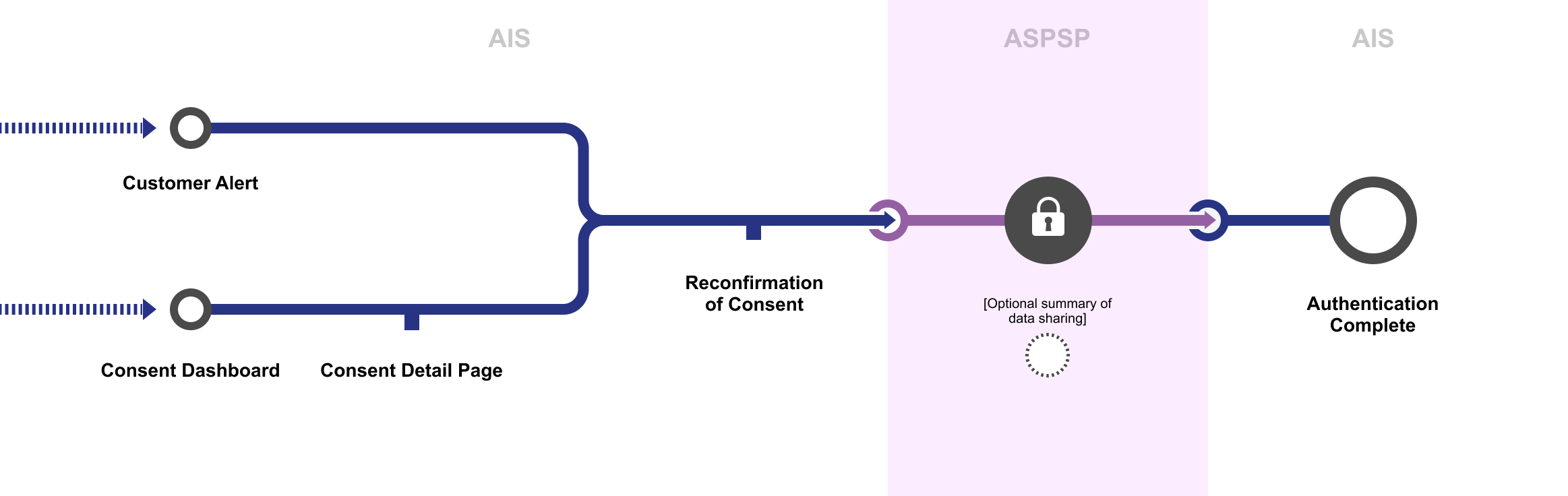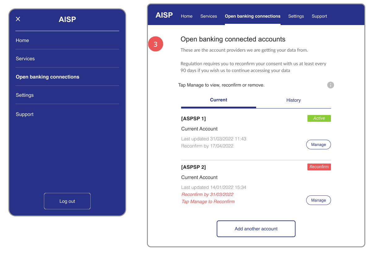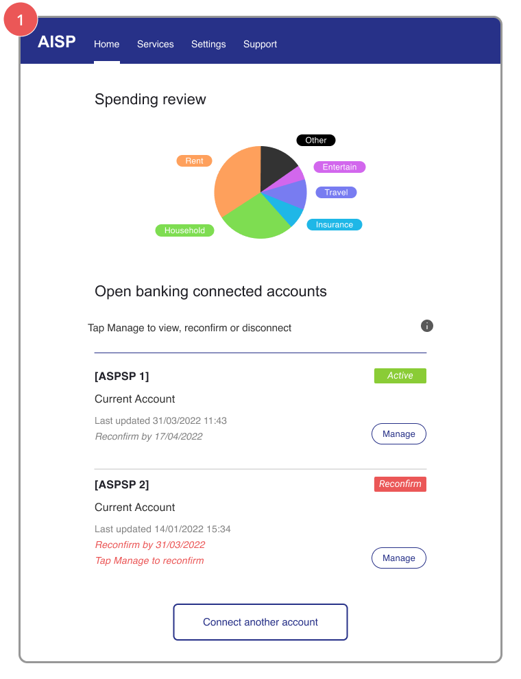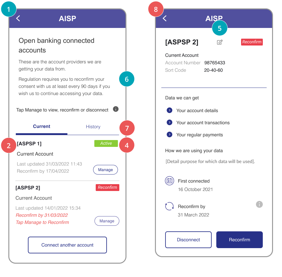 This content is best viewed on a desktop browser. 1 CEG Checklist Requirements 1AISPs must alert the PSU when reconfirmation of consent is required. There are many ways a PSU could receive this notification: as an alert, a message from the homepage or when checking their consent dashboard.If the PSU reconfirms a single consent via their consent dashboard, the customer journey would be consent dashboard homepage, detailed consent page, a summary of reconfirmation details.If the PSU is notified that they need to reconfirm consent, the AISP can take the PSU straight to the Summary of reconfirmation page.If the PSU reconfirms multiple consents via their consent dashboard, the customer journey would be as in figure 10: Consent Dashboard Homepage (select multiple consents), Summary & Confirmation completion after authentication at AISP.AISPs must not access data if the PSU has not reconfirmed consent. 2 CEG Checklist Requirements 2AISPs should allow the PSU to select all the payment accounts across ASPSPs that may or may not be due for reconfirmation.AISPs should make it clear that the PSU is being asked to authenticate to extend the AISP access to their account data and that no other element of the consent (e.g., the data permissions required, the purpose for which it will be used etc.) will change. 3 CEG Checklist Requirements 3AISPs must display the company’s trading name/brand name (i.e. the Client Name) to the PSU. If the AISP is only trading with its registered company name then it must display that name to the PSU.If the AISP is not the customer-facing entity and there is an Agent who is acting on behalf of the AISP, then the Agent must make the PSU aware that they are acting as an agent on behalf of the AISP and must also, display the AISP’s full trading name/brand name or registered company name whichever is the customer-facing brand of the AISP. AISPs must also, populate the Agent company name in the ‘On behalf of’ field of the software statement, in order to inform the ASPSP about the agency relationship and allow the ASPSP to be able to display this information to the PSU. Only in instances where there is an Agent acting on behalf of the AISP, the ‘On Behalf of’ name must be displayed to the PSU. AISPs must not populate the ‘ On behalf of’ field with the details of their TSP.The customer-facing entity must provide PSUs with sufficient information to enable them to make an informed decision. For example, detail the purpose for which the data will be used (including whether any other parties will have access to the information), the period over which it has been requested and when the consent for the account information will expire (consent could be ongoing or one-off). 4 CEG Checklist Requirements 4AISPs must also allow the PSU to select each consent and view the data permissions (clusters) that are associated with the consent without the need to change the consent. 5 CEG Checklist Requirements 5AISPs must allow the PSU to explicitly reconfirm their consent with equal prominence given to continue or discontinue the service. 6 CEG Checklist Requirements 6AISPs should provide confirmation to the PSU that reconfirmation of consent has been successfully completed. Select to scroll left Select to scroll right