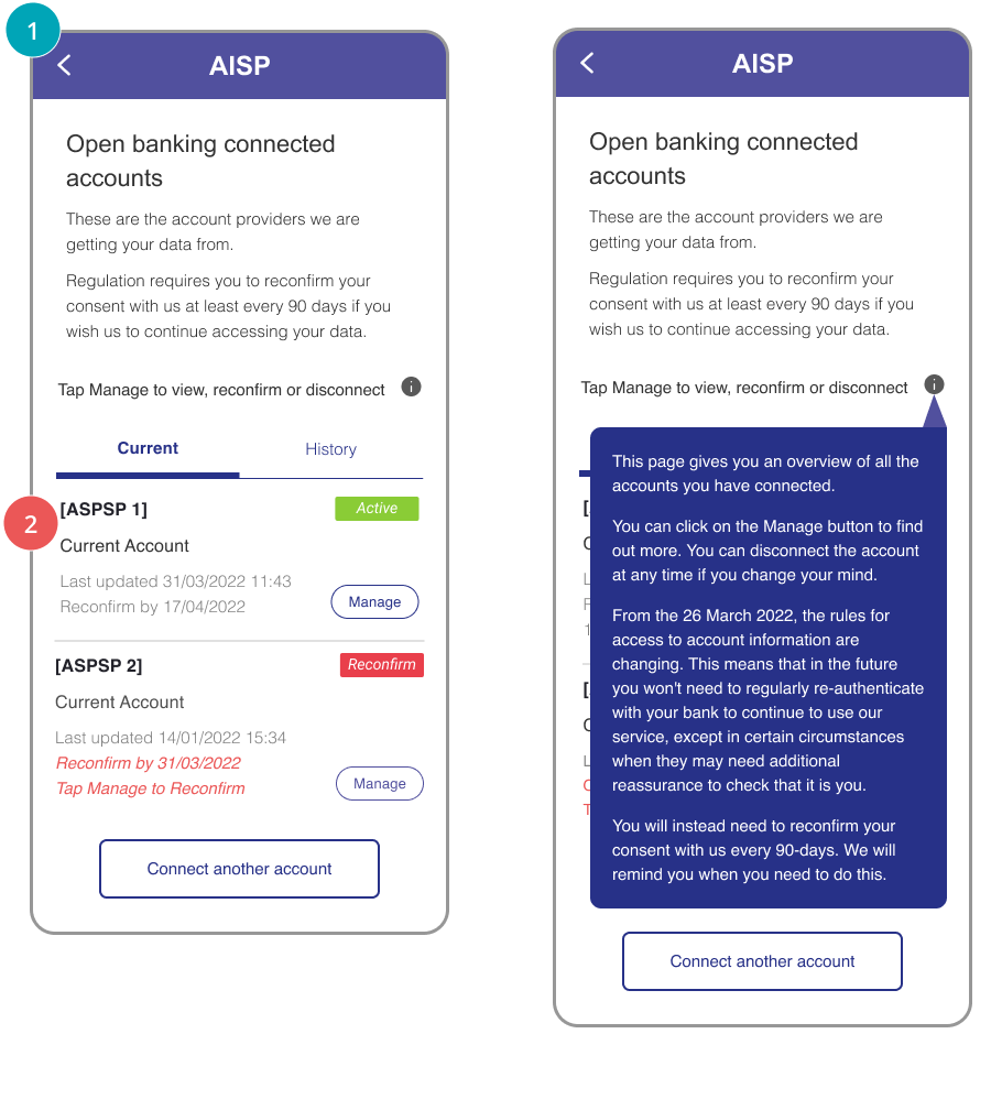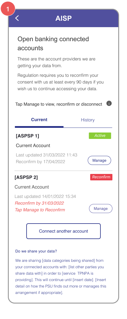 This content is best viewed on a desktop browser. 1 CEG Checklist Requirements 1In circumstances where re–authentication needs to be performed by the ASPSP to refresh AISP access, AISPs should alert the PSU. There are many ways a PSU could receive this notification: as an alert, a message from the homepage or when checking their Consent Dashboard.If the PSU reauthenticates at their ASPSP via their Consent Dashboard, the customer journey would be as set out in the wireframes: Consent Dashboard Homepage, a Detailed Consent Page, a Summary of reauthentication details followed by a confirmation page.If the PSU is notified that they need to reauthenticate with their ASPSP, the AISP can take the PSU straight to the Summary of reauthentication page 2 CEG Checklist Requirements 2AISPs must present a high-level summary of the data that is being requested and make it clear that this data and the purpose for which it will be used are the same as when originally requested. This should be done using the structure and language recommended by OBL following customer research (see Data Cluster Structure & Language below). AISPs must ensure that this request is specific to only the information required for the provision of their account information service to the PSU.AISPs should only present those data clusters relevant to the product type in question. Where the request is for multiple product types then the detail shown in the data cluster should explain to the customer the product type to which it applies or state that it is shared across multiple product types.AISPs should not redirect the PSU to their ASPSP without first summarising the reauthentication. 3 CEG Checklist Requirements 3AISPs should make it clear that the PSU is being asked to authenticate to extend the AISP access to their account data and that no other element of the consent (e.g., the data permissions required, the purpose for which it will be used etc.) will change.If the customer-facing entity is acting on behalf of an AISP as its agent, the PSU must be made aware that the agent is acting on behalf of the AISP. The customer-facing entity must also display the AISP’s full trading name.This can be presented to the PSU by displaying both the agent’s name and the regulated AISP name as:For you to use this service, acting on behalf of need to access information from your accounts at YOUR ASPSP. 4 CEG Checklist Requirements 4ASPSPs must not replay the data requested (as a default) or seek reconfirmation of consent.If an ASPSP is applying for the Art 10A exemption, following the application of initial SCA, ASPSPs must not apply SCA unless they have proportionate and objective reasons for doing so e.g. fraud or unauthorised access or revoked access accidentally at the ASPSP or request more data than permitted under Art 10a e.g. 100days of data. 5 CEG Checklist Requirements 5As part of the authentication journey, the ASPSP could have a call to action, for example, to an expandable section that the PSU can click on for information purposes only.If the ASPSP provides this option for the PSU as supplementary information, it will enable the PSU to view the data they have chosen to share with the AISP. This should be done using the structure and language recommended by OBL following customer research (see Data Cluster Structure & Language below).ASPSPs must display the AISPs’ trading name/brand name (i.e., the Client Name in the software statement) to the PSU during authentication screens and on any Access Dashboards. They do not need to display the registered company name of the TPP even if it is different.If there is an Agent acting on behalf of the AISP, ASPSPs must also display the Agent company name (as captured in the ‘On behalf of’ field of the software statement) to the PSU. (Please note that ASPSPs can show the Agency/On Behalf field only in cases where this information has been provided by AISPs).For examples of what names should be displayed, please refer to the Examples section below. 6 If the ASPSP has marked the consent status as ‘Cancelled’ when the PSU cancelled their access on the Access Dashboard or the ASPSP has marked it as ‘Cancelled’ for any reason where a reinstate is possible, then the ASPSP must mark the status back to ‘Authorised’ after successful authentication by the PSU. 7 CEG Checklist Requirements 6AISPs should confirm the successful completion of the account information request to the PSU. Select to scroll left Select to scroll right