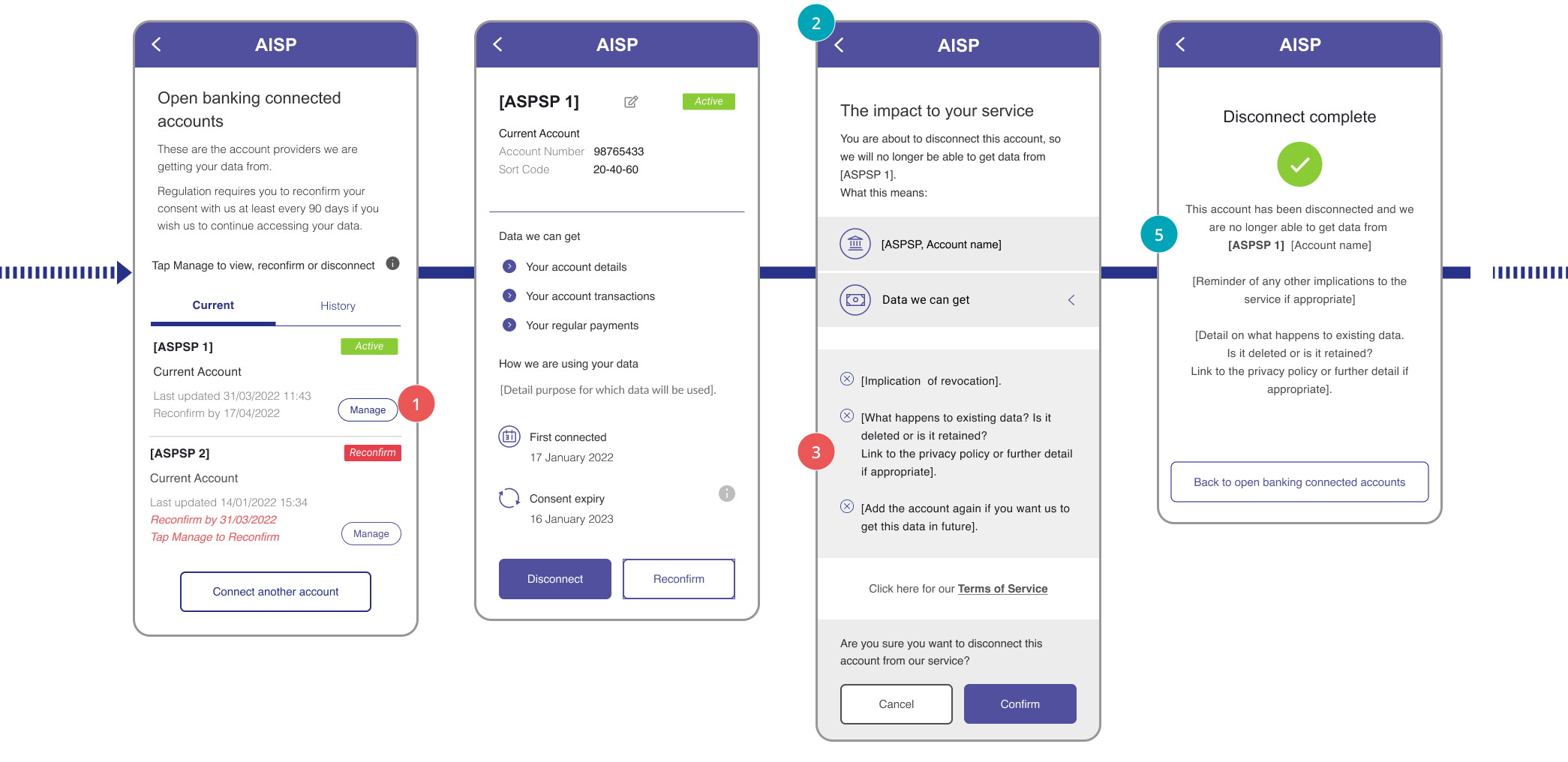 This content is best viewed on a desktop browser. 1 CEG Checklist Requirements 1The Consent Dashboard must allow a PSU to cancel the access they have consented to easily and without obstruction or excessive barriers. 2 CEG Checklist Requirements 2The AISP should make the exact consequences of cancelling the consent clear to the PSU – i.e., they will no longer be able to provide the specific service to the PSU.Once the PSU has clicked “Disconnect”, the AISP should only provide one screen prior to cancelling/revoking access, which clearly sets out the implications of cancelling to ensure that they want to proceed with the cancellation.A confirmation screen should be provided after this to confirm that the connection is no longer active. 3 CEG Checklist Requirements 3The confirmation screen must confirm what happens to any existing data which the AISP has already retrieved. AISPs must ensure that they are fair and transparent about how existing data is processed and that data that is no longer required is deleted, where appropriate. 5 CEG Checklist Requirements 5AISPs should inform the PSU that the connection to their account has been cancelled and no further account information will be provided by the ASPSP to the AISP as the PSU has withdrawn its access given to the AISP.After the Delete endpoint is called by the AISP to remove the account-access-consent resource, the ASPSPs are advised to inform the PSU via their own channels (for example via SMS or via a notification on their mobile phone) that the AISP will no longer have access to their account. This is an additional confirmation to the PSU that the AISP has completed the delete endpoint process correctly. Select to scroll left Select to scroll right