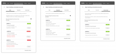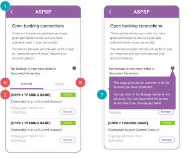 Dashboards Overview One of the primary objectives of the Customer Experience Guidelines is to provide simplification and consistency across all Open Banking implementations. As such, we have defined a core set of principles for dashboards that can and should be used, subject to the brand considerations of TPPs and ASPSPs. Learn more AIS Consent Dashboard Dashboards play an important role in managing the data for which a PSU has provided access consent to an AISP. PSUs may have consented to share data from several ASPSPs with a single AISP. AISPs must provide PSUs a dashboard to view and revoke their ongoing consents. Learn more AIS Access Dashboard Dashboards play an important role in managing the data for which a PSU has provided access consent for an AISP to access from their ASPSP. PSUs may have consented to share data from several accounts with a single AIS. ASPSPs must provide PSUs a dashboard to view and revoke the ongoing access for each account. Learn more PIS VRP Consent Dashboard A PSU may setup VRPs from different ASPSPs with a single PISP. The PISP must provide the PSU a dashboard to view and revoke the consents they have given. Dashboards play an important role in managing the conditions of VRPs for which the PSU has provided consent. Learn more PIS VRP Access Dashboard ASPSPs must provide PSUs with a facility to view and revoke ongoing VRP access that they have given to any PISP, for each account held at that ASPSP. The PSU may have consented to make payments from several accounts through a single PISP. Dashboards play an important role in setting out what accounts the PSU has given permissions for, and the rules associated. Learn more CBPII Consent Dashboard Dashboards play an important role in clearly and transparently setting out what a PSU has provided consent for a CBPII to do on their behalf. PSUs may have consented to Confirmation of Funds (CoF) access to several accounts from one or more ASPSPs. CBPIIs must provide PSUs with a Dashboard to view and revoke these consents. Learn more CBPII Revocation of Consent CBPIIs must provide PSUs with a facility to view and revoke consents that they have given to that CBPII. PSUs may have consented to CoF access to several accounts from one or more ASPSPs. Learn more CBPII Access Dashboard ASPSPs must provide PSUs with a facility to view and revoke CoF access that they have given to any CBPII for each account held at that ASPSP. Learn more CBPII Access Revocation ASPSPs must provide PSUs with a facility to view and manage CoF access that they have given to any CBPII. This page describes how the customer journey to revoke CoF access should be constructed. Learn more PSU Notifications Independent research by Ipsos MORI showed a strong desire from real customers for intelligent notifications from TPPs and ASPSPs. Here we make recommendations for the implementation of effective notifications. Learn more