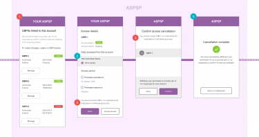 AIS Access Dashboard Dashboards play an important role in managing the data for which a PSU has provided access consent for an AISP to access from their ASPSP. PSUs may have consented to share data from several accounts with a single AIS. ASPSPs must provide PSUs a dashboard to view and revoke the ongoing access for each account. Learn more