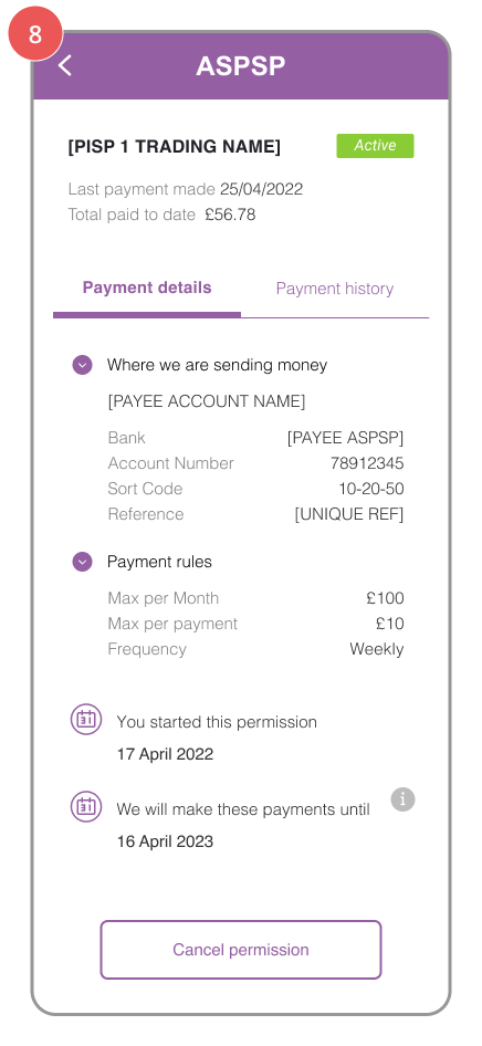 ASPSPs must provide PSUs with a facility to view and revoke ongoing VRP access that they have given to any PISP for each account held at that ASPSP. The PSU may have consented to make payments from several accounts with a single PISP.