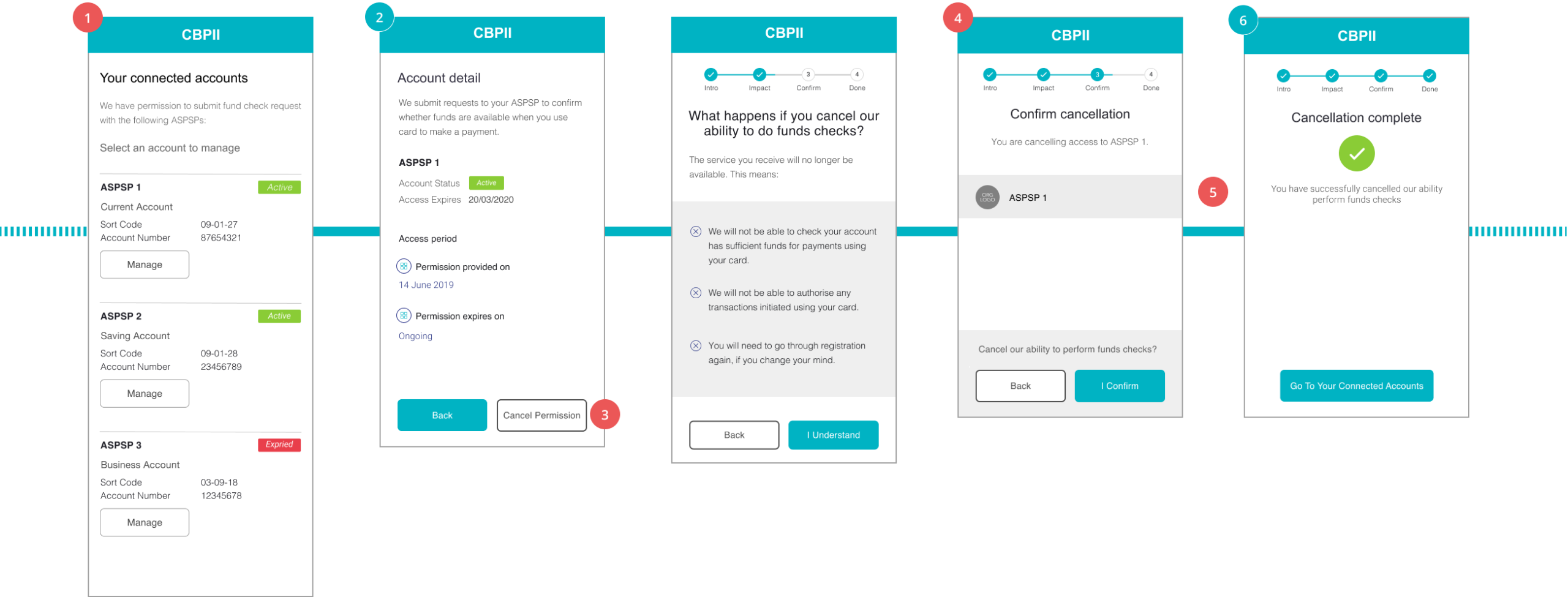 CEG Checklist Requirements & Customer Experience Considerations CEG Checklist Reference 1 Consent Dashboard The CBPII Consent Dashboard must display all Confirmation of Funds access consents provided to the CBPII. Thus, for each PSU account, there must be a consent entry granting CoF access to the account for CoF purposes by the PSU. The Consent Dashboard should also describe for each consent: •The ASPSP. •The ongoing nature of the consent and when the consent for CoF access to the account will expire. •The date the CoF consent was granted by the PSU. In addition, the CBPII Consent Dashboard could also include details on the purpose for which the funds checks is used (including whether any other parties will have access to the information) and clear and reassuring messages about what information is made available from the ASPSPs, as per the examples described in Single Domestic Payments – a/c selection @ PISP, item #2. 9 2 For each ASPSP account granted CoF access, CBPIIs should display the PSU payment account identification (such as account name, sort code and account number) and expiration date and time. Note: PSU account number should be masked. 3 CBPIIs must allow PSUs to revoke the CoF consent for each specific ASPSP account. 9 4 Cancellation Request CBPIIs must allow PSUs to confirm that they want to cancel CoF consent of their account to the CBPII. CBPIIs should inform PSUs that once CoF consent is revoked, the CBPII will no longer be able to check the availability of funds in their account. CBPIIs should inform PSUs of the exact consequences of cancelling their consent, for example it may cause their CBPII transactions to be declined or they will no longer be able to receive the specific services from the CBPIIs etc. CBPIIs should give equal prominence to the choices of continuing or cancelling the CBPII CoF consent. 9 5 CBPIIs must inform ASPSPs that PSUs have withdrawn their consent by making call to the DELETE API endpoint as soon as practically possible (as described in Version 3 of the Read/Write API specifications). This will ensure that no further CoF account access will be accepted by ASPSPs. Note1: ASPSPs must support the Delete process as described in the Version 3 Read/Write API specifications. Note 2: This activity is not visible to PSUs as it takes place in the background, however it will ensure no further CoF responses are provided by ASPSPs to CBPIIs). 9 6 CBPII ConfirmationCBPIIs should confirm to PSUs that CoF consent to their account has been cancelled.