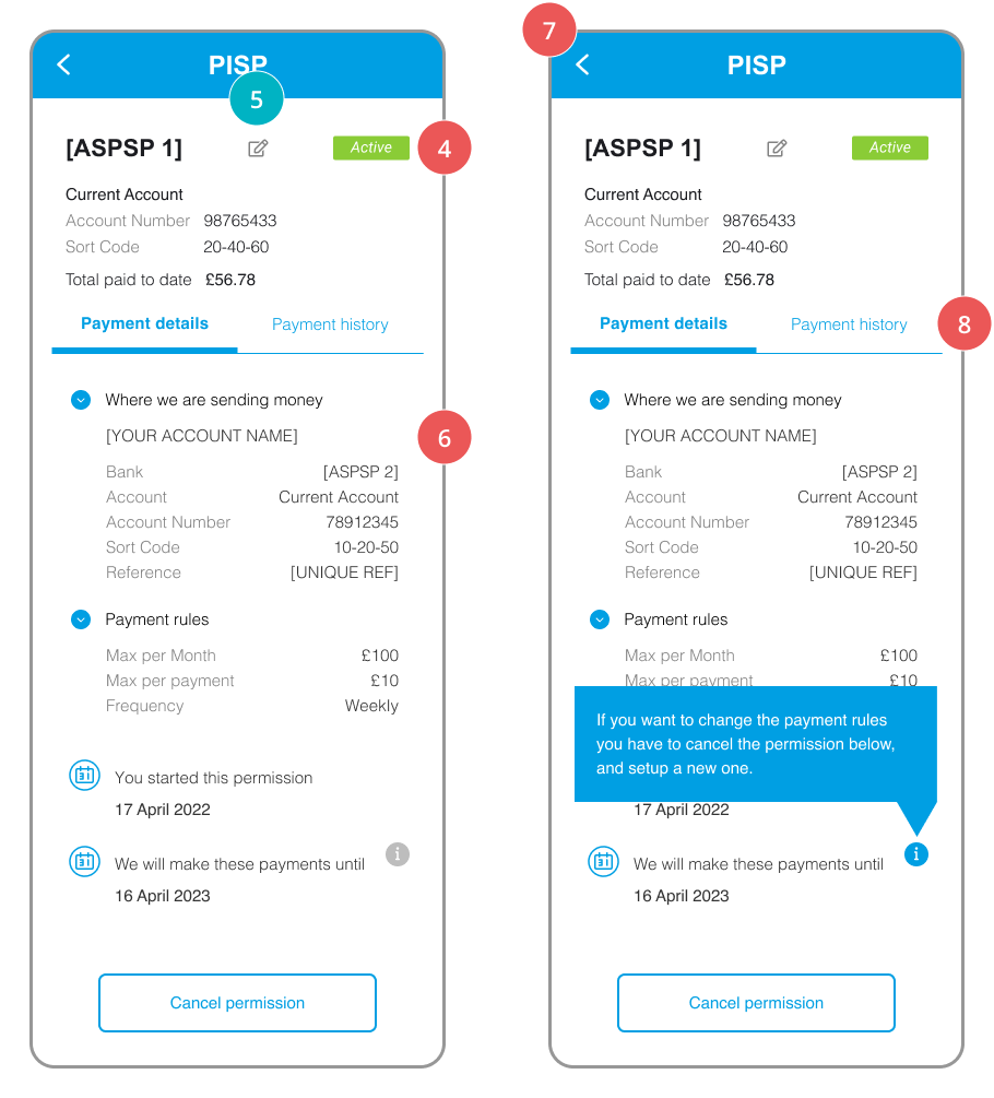 CEG Checklist Requirements & CX Considerations 1 To aid clarity whilst providing detailed information if the PSU needs it, a VRP Consent Dashboard should provide an overview screen (VRP Consent Dashboard Home Page) which lists high level information for all consents, and a detailed page for each consent (VRP Consent Dashboard Detailed Page). 2 The customer-facing entity must provide PSUs with sufficient information to enable them to make an informed decision on the Consent Dashboard Home Page. As a minimum, PISPs must show on the Consent Dashboard Home Page: ASPSP Name (or nickname if used) Account type (if provided) Start date i.e., date consent was first granted End date or where relevant then ongoing nature of the consent Date Last Payment was made Total paid till to date A status flag which is “Active” (see below on status messages) Warnings or alerts if the consent is close to expiry. The PISP can define how close to the expiry date it should start to alert the PSU depending on their business model. The PISP must also provide a manage button that allows the PSU to revoke consent or make changes to existing consent parameters. Refer to section Making changes to VRP Consent for details. 9d 3 PISP should offer functionality (e.g., search, sort, filter) to enable a PSU to search for the relevant consent. This will be of particular benefit as the number of consents for different ASPSPs/accounts given by a PSU to PISPs increases. 4 PISPs must use just three status flags: “Active” or “Expired” or “Cancelled”. Consent is defined as active if it has a valid access token that has not expired, or the consent expiry date has not elapsed. Cancelled when the PSU has revoked consent on the Consent Dashboard or revoked VRP access at the ASPSP. PISPs must be mindful that a PSU could have revoked VRP access at the ASPSP. PISPs must not show different status messages at their Consent Dashboard to those that a PSU would see at their ASPSP Access Dashboard. There are a variety of methods that a PISP can use to check that their access token is still valid. See this page for further details. 9d 5 PISPs should provide the ability for a PSU to edit the ASPSP Name so that it can be replaced with a ‘nickname’ (such as “Household Account” or “Holiday Savings Pot”) to help PSUs identify their accounts easily. 6 PISPs should provide additional explanatory text to help PSUs understand how to cancel long-lived consent and an overview of the payment details. Using information bubbles helps to keep information manageable. In the example provided we use the language “payment details” but PISPs can decide how best to explain this point. 7 PISPs must provide a Consent Dashboard, Detailed Page, for each Consent, which includes: ASPSP Name (or nickname if used) Account type (e.g., current account) PSU’s paying from Sort Code and Account Number The date the consent was granted The date consent will expire Payee details Only the consent parameters that are agreed with the PSU for their proposition. Refer to VRP and Sweeping journeys in the CEG for example parameters. PISPs may include the following at their discretion: Last payment made date. The total amount paid as of today. 9d 8 PISPs must make available a list of consents that have been cancelled or expired so that the PSU has a record of old consents. Where the connection has been cancelled (revoked) or expired should be placed in the history, with cancelled or expired status. 9e