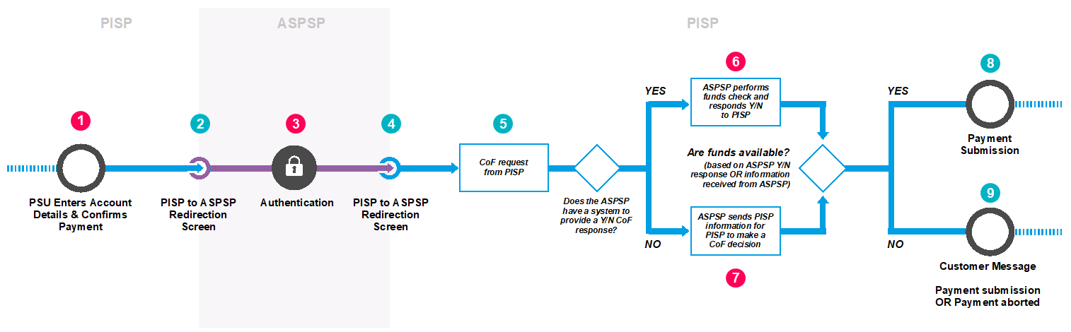 This content is best viewed on a desktop browser. 1 CEG Checklist Requirements 1Minimum Set of Parameters: As per Single Domestic Payments – a/c selection @ PISP, item #1. PSU Consent to PISP : As per Single Domestic Payments – a/c selection @ PISP, item #3. PISP connects to ASPSP and stages payment. 2 CX Considerations 2As per Single Domestic Payments – a/c selection @ PISP, item #5. 3 CEG Checklist Requirements 3The ASPSP must apply SCA (including dynamic linking) unless an exemption applies as per section Single Domestic Payments – a/c selection @ PISP (unless supplementary information is required, as per section Single Domestic Payments – Supplementary info). 4 CX Considerations 4As per Single Domestic Payments – a/c selection @ PISP, item #9. 5 CX Considerations 5The PISP must be able to submit a CoF request after the ASPSP has authenticated the PSU. 6 CEG Checklist Requirements 6If the ASPSP has built a system enabling it to respond to the CoF request, it must provide the Y/N response at this time. Note: The ASPSP could allow a PISP to initiate a payment even if the PSU does not have sufficient funds. In that case, the ASPSP must reply with a ‘N’ when the PISP makes a CoF request. 7 CEG Checklist Requirements 7If the ASPSP does not have a system in place that enables it to adequately respond to a confirmation request, it must provide the PISP with the necessary data to determine availability of funds. 8 CX Considerations 8The PISP can submit the payment for execution on receiving a ‘Y’. 9 CX Considerations 9If the PISP receives a ‘N’ response, the PISP should provide an appropriate message to the PSU to inform them of the unavailability of sufficient funds. For example, the PISP could request the PSU to add funds to their account within a certain period. The PISP could either submit the payment to the ASPSP for execution or decide not submit the payment for execution. In both instances, the PISP must inform the PSU whether the payment has been successfully initiated or not. The PISP could also potentially make further requests on receiving a ‘N’ response provided this is allowed by the ASPSP and the authorisation has not expired. Select to scroll left Select to scroll right