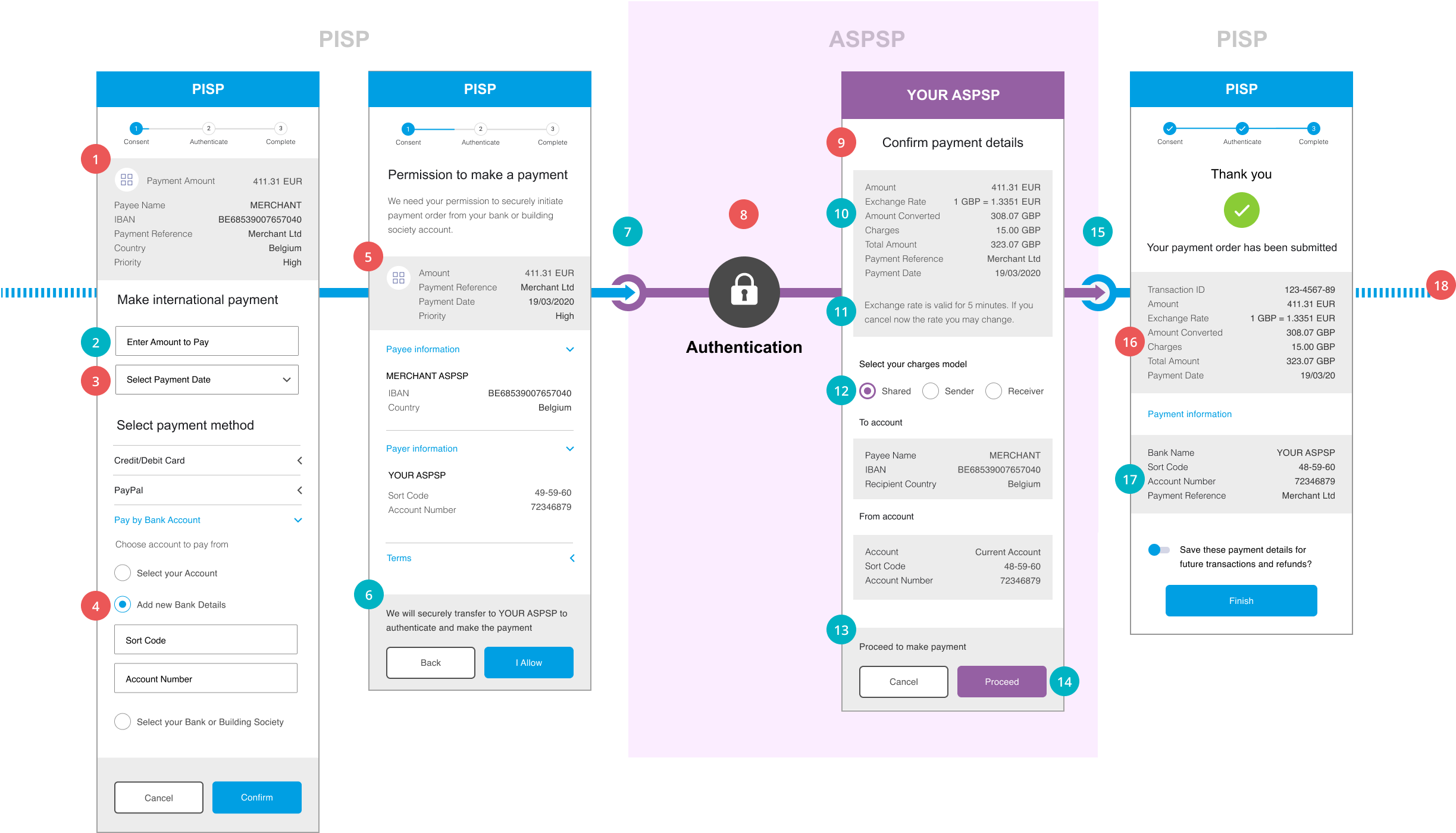 This content is best viewed on a desktop browser. 1 CEG Checklist Requirements 1Minimum Set of Parameters: PISPs must either allow PSUs to specify the below minimum set of parameters or pre-populate them (e.g. in cases of supplier invoice payments or eCommerce journeys): • Payment Amount and Currency. • Destination Country. • Instruction Priority (Normal or Urgent). • Payee Account Name. • Payee Account Identification details (e.g.. IBAN) 1. • Payment Reference – This is optional filed but it is good practice to be populated for a payment. • Any supplementary information required which the ASPSP has published as required and is specific to that ASPSP. 2 CX Considerations 2PISPs could display an indicative FX rate for the payment currency pair if: • PSUs selected a PSU payment Account or provided PSU payment Account details in item 4. • PSUs provided the currency of the selected PSU payment Account. In that case, PISPs must clearly indicate to PSUs that the FX rate displayed is indicative and may be different to the FX rate to be provided by their ASPSPs. If the PISP has the ability to provide any actual FX rate quote to the PSU at this stage (e.g. having implemented a quoting mechanism with the ASPSP) then the PISP should be able to display the actual FX rate to be used for the transaction. 3 CEG Checklist Requirements 3If PISPs want to offer PSUs the ability to make an International Scheduled Payment (Future Dated),then PISPs must allow PSUs to select the requested execution date for the payment, or pre-populate this information as part of the payment order request. 4 CEG Checklist Requirements 4PSU payment Account Selection: As per Single Domestic Payments – a/c selection @ PISP, item #2. 5 CEG Checklist Requirements 5PSU Consent to PISP: PISPs must request for the PSUs’ consent to the payment in a clear and specific manner. PISPs must display the following information in the consent screen: Payment Amount and Currency. Destination Country. Instruction Priority (Normal or Urgent). Payee Account Name. Requested Payment Execution Date (same day processing or future date). Payment Reference and any supplementary info, if it has been entered by PSUs or pre-populated by PISPs in item #1. PSU payment Account Identification and/or the selected ASPSP (based on item #2 options). Note 1: If PSU payment Account identification is selected in item #2, PISPs should mask the PSU payment Account details on the consent screen. Otherwise, if the PSU payment Account identification has been input by PSUs in item #2, PISPs should not mask these details to allow PSUs to check and verify correctness Note 2: If PSU payment Account identification is provided by PSUs in item #2, PISPs could use this to identify and display the ASPSP without having to ask PSUs For Payee Account Identification details (e.g. IBAN) 1. If this has been provided by PSUs in item #1, then PISPs must also display this in the consent screen to allow PSUs to check and verify correctness. If this has been pre-populated by PISPs (e.g. in a eCommerce payment scenario) PISPs could choose whether to display this information or not . 6 CX Considerations 6As per Single Domestic Payments – a/c selection @ PISP, item #4. 7 CX Considerations 7As per Single Domestic Payments – a/c selection @ PISP, item #5. 8 CEG Checklist Requirements 8As per Single Domestic Payments – a/c selection @ PISP, item #8. 9 CEG Checklist Requirements 9Supplementary Information / Additional Payment Order Details ASPSPs must be able to introduce a step as part of the authentication journey to display supplementary information associated with that payment, if required. Moreover, ASPSPs must allow the PSU to provide additional details related to the payment order during the authentication journey (authentication and supplementary information screens) such as for example, the account for the payment. The information to be provided in the supplementary information / additional payment order details screen may include: PSU payment Account Identification. Payee Account Name. Payment Reference. Payee Account Identification details (e.g. account number and sort code or additionally roll number or full IBAN). Country. Payment Currency. Payment Amount. FX currency pair and rate. Charges model (BEN/SHA/OUR) (for definitions please refer to appendix section PIS parameters and considerations). Payment priority (Normal or Urgent). Payment Execution Date (same day processing or future date). 10 CX Considerations 10ASPSPs must display to the PSU the FX currency conversion rate to be used for the payment order. This FX rate can be: Indicative – In this case ASPSPs must clearly inform PSUs that the FX rate is indicative and may be different than the actual rate that will be used for the payment order. Actual – ASPSPs must clearly inform PSUs for the validity period of this actual FX rate. If the payment order is not submitted within the validity window of the FX, then a new actual FX quote must be displayed. If PSUs confirm the payment but the payment order submitted by PISPs is not submitted within validity period, ASPSPs could choose to either reject the payment or process it at the agreed FX rate. ASPSPs could display the payment amount in the PSU payment Account currency (from applying the FX rate). 11 CX Considerations 11ASPSPs must ensure that charges related to international payments are provided to PSUs as agreed in the framework contract. Note1: Any provision of charges can only be those of the ASPSP as the Beneficiary’s bank charges are not known in many cases. Note 2: Where the final charges are not known to the ASPSP, the responsibility should remain with the ASPSP for notifying the customer of the charges as per the PSD2 regulatory requirements. 12 CX Considerations 12Other Options: ASPSPs should display the Final Debit Amount (including charges) in PSU payment Account currency. ASPSPs could display the expected Value Date for the internation