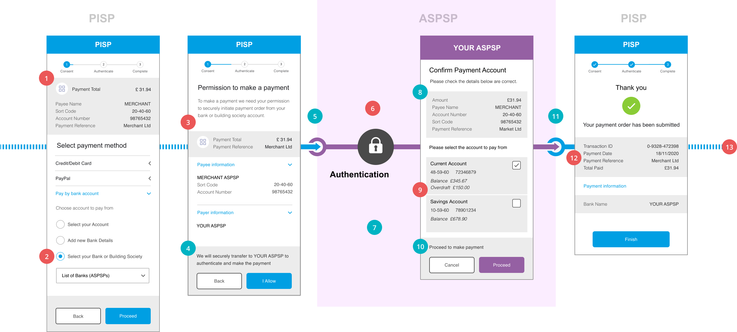 This content is best viewed on a desktop browser. 1 CEG Checklist Requirements 1Minimum Set of Parameters: As per Single Domestic Payments – a/c selection @ PISP, item #1. 2 CEG Checklist Requirements 2PSU payment Account Selection: As per Single Domestic Payments – a/c selection @ PISP, item #2. 3 CEG Checklist Requirements 3PSU Consent to PISP PISPs must request for the PSUs’ consent to the payment initiation in a clear and specific manner. PISPs must display the following information in the consent screen: Payment Amount and Currency (GBP for UK implementations). Payee Account Name. Payment Reference, if it has been entered by PSUs or prepopulated by PISPs in item #1. Selected ASPSP (based on item #2 options). For Payee Account Identification details (e.g. account number and sort code or additionally roll number or full IBAN): If this has been provided by PSUs in item #1, then PISPs must also display this in the consent screen to allow PSUs to check and verify correctness. If this has been pre-populated by PISPs (e.g. in a eCommerce payment scenario) PISPs could choose whether to display this information or not. 4 CX Considerations 4As per Single Domestic Payments – a/c selection @ PISP, item #4. 5 CX Considerations 5As per Single Domestic Payments – a/c selection @ PISP, item #5. 6 CEG Checklist Requirements 6ASPSPs must apply SCA including dynamic linking, unless an exemption applies. The ASPSP authentication must have no more than the number of steps that the PSU would experience when directly accessing the ASPSP channel 7 CX Considerations 7ASPSPs could also display a message to prompt PSUs to authenticate to continue with their payment instruction. 8 CX Considerations 8Once the PSU has selected their account, ASPSPs should display the following information to the PSU: Payment Amount and Currency (GBP for UK implementations). Payee Account Name. Payment Reference, if it has been entered by PSUs or prepopulated by PISPs in item #1. The account selected by the PSU for payment. Payee Account Identification details (e.g. account number and sort code or additionally roll number or full IBAN). 9 CEG Checklist Requirements 9Additional Parameters ASPSPs must allow PSUs to select the payment account to complete the payment order for execution. It is up to ASPSP to consider relevant obligations relating to the FCA’s High Cost Credit Review: Overdrafts consultation paper and policy statement (CP18/42) & (PS19/16)” 10 CX Considerations 10ASPSPs should inform PSUs about their “point of no return” for making the payment and that their payment will be made after pressing the Proceed button. Example wording: “Press Proceed to make payment“. 11 CX Considerations 11As per Single Domestic Payments – a/c selection @ PISP, item #9. 12 CEG Checklist Requirements 12PISP Confirmation: As per Single Domestic Payments – a/c selection @ PISP, item #10. 13 CEG Checklist Requirements 13Further Payment Status Update: As per Single Domestic Payments – a/c selection @ PISP, item #12. Select to scroll left Select to scroll right