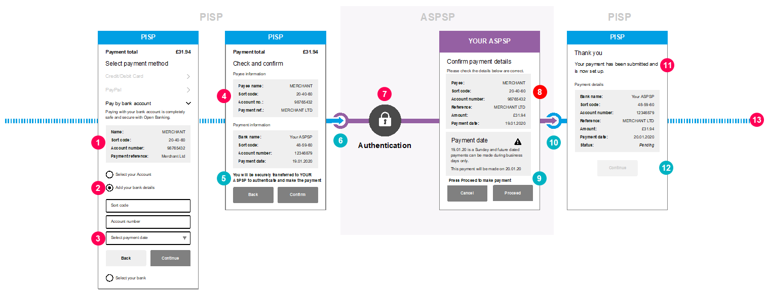 This content is best viewed on a desktop browser. 1 CEG Checklist Requirements 1Minimum Set of Parameters: As per Single Domestic Payments – a/c selection @ PISP, item #1. 2 CEG Checklist Requirements 2PSU payment Account Selection: As per Single Domestic Payments – a/c selection @ PISP, item #2. 3 CEG Checklist Requirements 3Execution Date: PISPs must either enable PSUs to select the expected execution date or populate and display the expected execution date for the payment order. 4 CEG Checklist Requirements 4PSU Consent to PISP PISPs must request for the PSUs’ consent to the payment in a clear and specific manner. PISPs must display the following information in the consent screen: Payment Execution Date. Payment Amount and Currency (GBP for UK implementations). Payee Account Name. Payment Reference, if it has been entered by PSUs or pre-populated by PISPs in item #1. PSU payment Account Identification and/or the selected ASPSP (based on item #2 options). Note 1: If PSU payment Account identification is selected in item #2, PISPs should mask the PSU payment Account details on the consent screen. Otherwise, if the PSU payment Account identification has been input by PSUs in item #2, PISPs should not mask these details to allow PSUs to check and verify correctness. Note 2: If PSU payment Account identification is provided by PSUs in item #2, PISPs could use this to identify and display the ASPSP without having to ask PSUs. For Payee Account Identification details (e.g. account number and sort code or additionally roll number or full IBAN): If this has been provided by PSUs in item #1, then PISPs must also display this in the consent screen to allow PSUs to check and verify correctness. If this has been pre-populated by PISPs (e.g. in a eCommerce payment scenario) PISPs could choose whether to display this information or not . 5 CX Considerations 5As per Single Domestic Payments – a/c selection @ PISP, item #4. 6 CX Considerations 6As per Single Domestic Payments – a/c selection @ PISP, item #5. 7 CEG Checklist Requirements 7As per Single Domestic Payments – a/c selection @ PISP, item #8. 8 CEG Checklist Requirements 8ASPSPs must display the payment details and any supplementary information about difference in actual execution date. 9 CX Considerations 9ASPSPs should inform PSUs about their “point of no return” for making the payment and that their payment will be made after pressing the Proceed button. Example wording: “Press Proceed to make payment“. 10 CX Considerations 10As per Single Domestic Payments – a/c selection @ PISP, item #9. 11 CEG Checklist Requirements 11PISP Confirmation: As per Single Domestic Payments – a/c selection @ PISP, item #10. 12 CX Considerations 12PISPs must provide message to PSUs to inform that amendment or cancellation of the payment must be done at their ASPSP. 13 CEG Checklist Requirements 13Further Payment Status Update: As per Single Domestic Payments – a/c selection @ PISP, item #12. Select to scroll left Select to scroll right