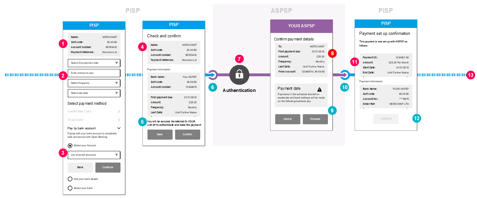 This content is best viewed on a desktop browser. 1 CEG Checklist Requirements 1Minimum Set of Parameters PISPs must either allow PSUs to specify the below minimum set of parameters or pre-populate them for the PSUs: Creditor Account Name. Creditor Account Identification (e.g. account number and sort code or roll number for UK implementations). Reference of the payment (as per best practice). Any supplementary information required which the ASPSP has published as required and is specific to that ASPSP. 2 CEG Checklist Requirements 2tanding Order Schedule(s) PISPs must either allow PSUs to select at least one of following options or pre-populate them for the PSUs: The First payment date, payment Amount and Currency (GBP for UK implementations). The Recurring payment date, payment Amount and Currency (only if different from the first payment amount and date). If standing order is not open ended: Either the Final payment Date (only if different from the Recurring payment date), payment Amount and Currency (GBP for UK implementations). Or the Number of payments to be made by the standing order. The Frequency of the payments (for available options on standing order frequency, please refer to Appendix section 7.4.1). 3 CEG Checklist Requirements 3PSU payment Account Selection: As perSingle Domestic Payments – a/c selection @ PISP, item #2. 4 CEG Checklist Requirements 4PSU Consent to PISP PISPs must request for the PSUs’ consent to the payment in a clear and specific manner. PISPs must display the following information in the consent screen: The Standing Order Schedule parameters including first payment, recurring payment, final payment and frequency as selected in item #3. Payee Account Name. Payment Reference and any supplementary info, if it has been entered by PSUs or prepopulated by PISPs in item #1. PSU payment Account Identification and/or the selected ASPSP (based on item #2 options). Note 1: If PSU payment Account identification is selected in item #2, PISPs should mask the PSU payment Account details on the consent screen. Otherwise, if the PSU payment Account identification has been input by PSUs in item #2, PISPs should not mask these details to allow PSUs to check and verify correctness. Note 2: If PSU payment Account identification is provided by PSUs in item #2, PISPs could use this to identify and display the ASPSP without having to ask PSUs. For Payee Account Identification details (e.g. account number and sort code or additionally roll number or full IBAN): If this has been provided by PSUs in item #1, then PISPs must also display this in the consent screen to allow PSUs to check and verify correctness. If this has been pre-populated by PISPs (e.g. in a eCommerce payment scenario) PISPs could choose whether to display this information or not. 5 CX Considerations 5As per Single Domestic Payments – a/c selection @ PISP, item #4. 6 CX Considerations 6As per Single Domestic Payments – a/c selection @ PISP, item #5. 7 CEG Checklist Requirements 7As per Single Domestic Payments – a/c selection @ PISP, item #8. 8 CEG Checklist Requirements 8ASPSPs must display the payment details, schedule and any supplementary information about difference in actual execution day for each transaction. 9 CX Considerations 9 ASPSPs should inform PSUs about their “point of no return” for making the payment and that their payment will be made after pressing the Proceed button. Example wording: “Press Proceed to make payment“. 10 CX Considerations 10As per Single Domestic Payments – a/c selection @ PISP, item #9. 11 CEG Checklist Requirements 11PISP Confirmation: As per Single Domestic Payments – a/c selection @ PISP, item #10. 12 CX Considerations 12PISPs must provide a message to PSUs to inform that modification or cancelling of the standing order must be done at their ASPSP. 13 CEG Checklist Requirements 13Further Payment Status Update: As per Single Domestic Payments – a/c selection @ PISP, item #12. Select to scroll left Select to scroll right