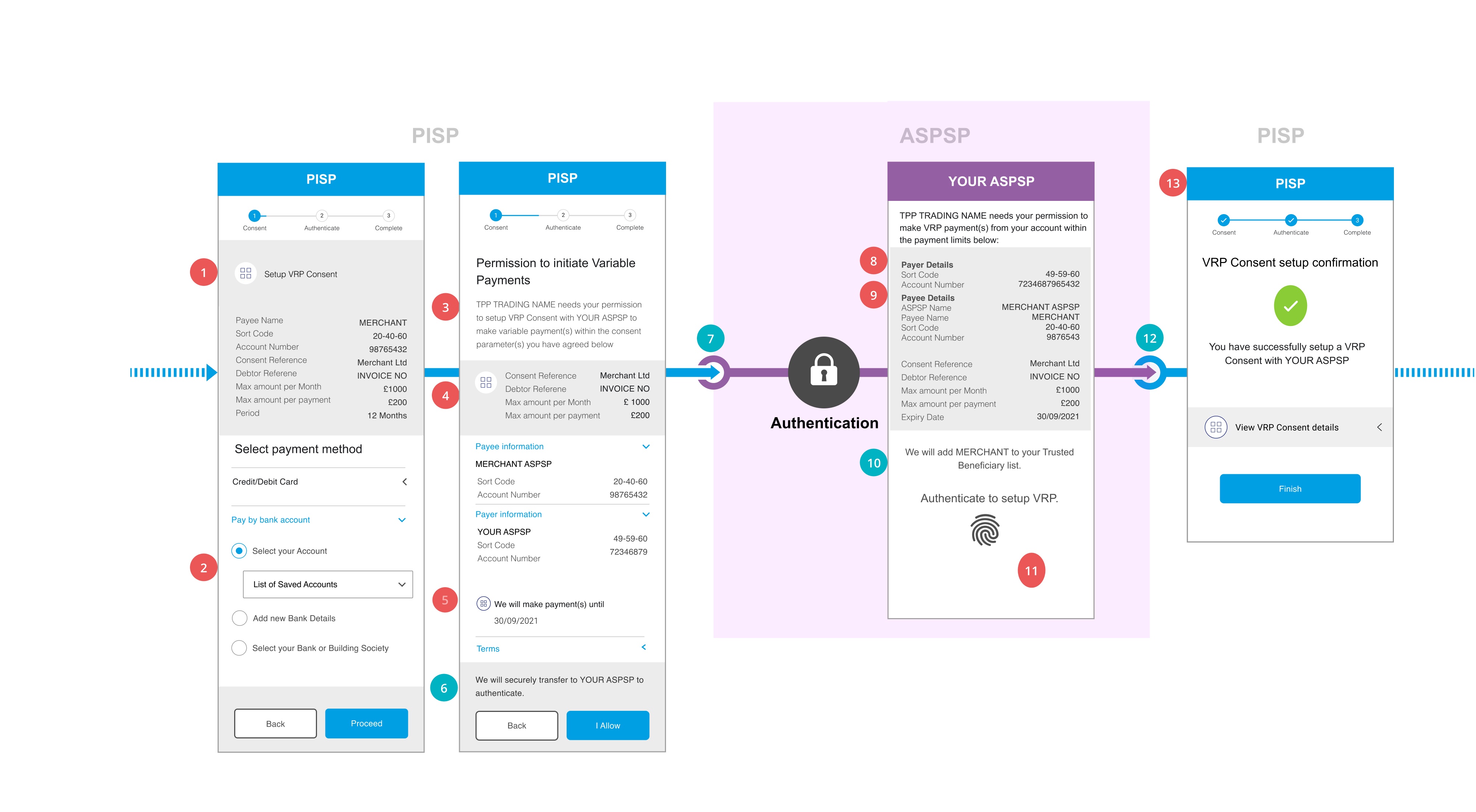 This content is best viewed on a desktop browser. 1 CEG Checklist Requirements 1Minimum Set of Parameters PISPs must either allow PSUs to specify the below minimum set of parameters or pre-populate them for the PSUs enabling the PSU to amend: Payee Account Name. Payee Account Identification details (e.g. account number and sort code or additionally roll number or full IBAN). Payment Reference – This is optional but it is good practice to be populated for a payment. Maximum amount per payment and Currency (GBP for UK implementations). Maximum amount per month. Expiry Date (Ongoing or a Specific Date). Any supplementary information required which the ASPSP has published as required and is specific to that ASPSP. 2 CEG Checklist Requirements 2PSU payment Account Selection PISPs must provide PSUs at least one of the following options: • Enter their Payer’s payment Account Identification details. •PISPs must allow PSUs to enter their payment Account Identification details in at least one of the ways specified in the OBIE V3 Read/Write API Specifications (e.g. account number and sort code – with additional roll number if required, IBAN, PAN, Paym and other formats). • Select their Account Identification details (this assumes they have been saved previously). • Select their ASPSP in order to select their PSU payment Account from there later on in the journey. Note1: In some of the above cases, PISPs may also need PSUs to provide their ASPSP name so that PISPs can check whether ASPSPs will be able to match the account identifier to the underlying PSU payment account. Note 2: The use of IBAN as an identification of the payer account for UK ASPSPs is not expected to be heavily used as account and sortcode are the main account identifiers used in the UK. IBAN however will be used by non UK ASPSPs implementing OBIE standards and offering their services in the UK. 3 CEG Checklist Requirements 3Use of clear language to the PSU that they will be consenting to give the PISP the ability to make payment on a (sporadically or periodically) recurring basis. PISPs must display the company’s trading name/brand name (i.e. the Client Name) to the PSU during the setup and revocation of consent. If the PISP is only trading with its registered company name then it must display that name to the PSU. If the PISP is not the customer-facing entity and there is an Agent who is acting on behalf of the PISP, then the Agent must make the PSU aware that they are acting as an agent on behalf of the PISP and must also, display the PISP’s full trading name/brand name or registered company name whichever is the customer-facing brand of the PISP. PISPs must also, populate the Agent company name in the ‘On behalf of’ field of the software statement, in order to inform the ASPSP about the agency relationship and allow the ASPSP to be able to display this information to the PSU (please refer to item #5). Only in instances where there is an Agent acting on behalf of the PISP, the ‘On Behalf of’ name must be displayed to the PSU. PISPs must not populate the ‘ On behalf of’ field with the details of their TSP. 4 CEG Checklist Requirements 4PSU Consent to PISP PISPs must display the following information in the consent screen: Control Parameters Payment Reference, and any supplementary info, if it has been entered by PSUs or pre-populated by PISPs in item #1. Maximum amount per payment and Currency. Maximum amount per month. Expiry Date as selected by the PSU. Payee Information Payee Account Name. For Payee Account Identification details (e.g. account number and sort code or additionally roll number or full IBAN): If this has been provided by PSUs in item #1, then PISPs must also display this in the consent screen to allow PSUs to check and verify correctness. If this has been pre-populated by PISPs (e.g. in an eCommerce payment scenario) PISPs could choose whether to display this information or not. Payer Information PSU payment Account Identification and/or the selected ASPSP (based on item #2 options). Note: if PSU payment Account identification is provided by PSUs in item #2, PISPs could use this to identify and display the ASPSP without having to ask PSUs. 5 CEG Checklist Requirements 5T&Cs PISPs must enable the PSUs to view their T&Cs on the consent screen. 6 CX Considerations 6PISPs should provide messaging to inform PSUs that they will be taken to their ASPSPs to complete the payment. Example wording: %22We will securely transfer to YOUR ASPSP to authenticate and make the payment“. 7 CX Considerations 7Generic PISP to ASPSP redirection screen and message. Please refer to sections Browser based redirection – PIS, App based redirection – PIS and Effective use of redirection screens. 8 CEG Checklist Requirements 8Additional Parameters ASPSPs must allow PSUs to select the payment account to complete the VRP setup only if the PSU has not provided it to the PISP in item #1. It is up to ASPSP to consider relevant obligations relating to the FCA’s High Cost Credit Review: Overdrafts consultation paper and policy statement (CP18/42) & (PS19/16)”. 9 CEG Checklist Requirements 9ASPSPs must display all the consent parameter(s) provided by the PISP. These details must be displayed as part of the authentication journey on at least one of the following screens without introducing additional confirmation screens (unless supplementary information is required, refer to section Single Domestic Payments – Supplementary info. ASPSPs’ Authentication screen (recommended). ASPSP to PISP redirection screen Note: The ASPSP must inform the PSU that the payee will be added to their Trusted Beneficiary list or could choose an alternative available SCA exemption for subsequent payments made by the PISP. 10 CX Considerations 10For recognition based biometrics (e.g. Face ID) which can be more immediate the biometric authentication should be invoked after a delay or through a call to action to allow the PSU the abil