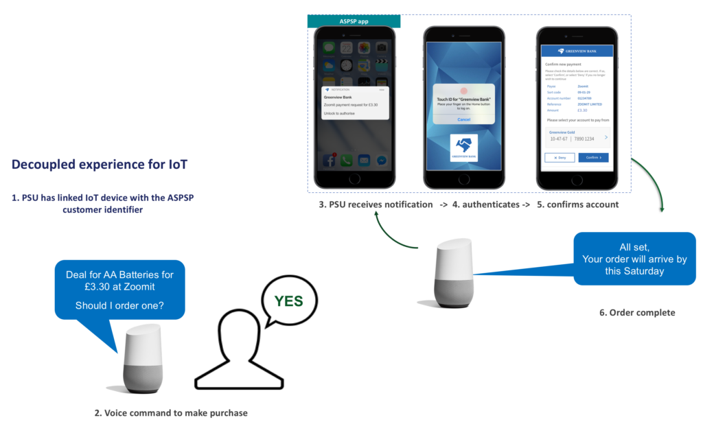 A decoupled approach to authentication offers a better customer experience for use cases that involve POS, IoT devices, telephony or where PSU interaction is either not possible or not required within the TPP channel.