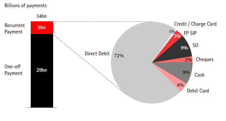 74% of consumer recurring payments are made by Direct Debits where as 4% are made through cards. 9% of these recurring payments are Standing Orders, though currently these can only be setup on an ASPSP channel.